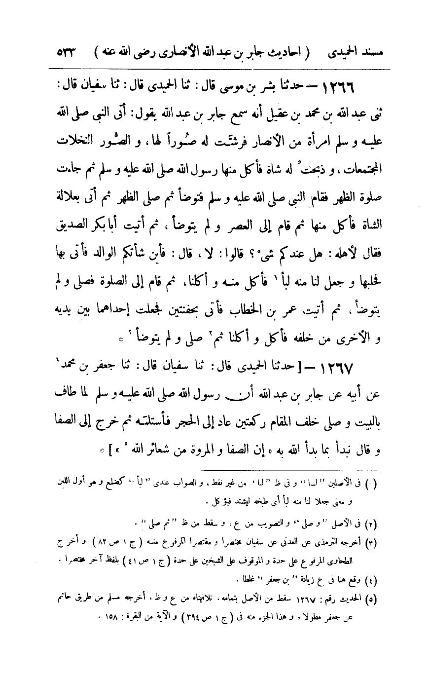 1266 - حدثنا بشر بن موسى قال ثنا الحميدي قال ثنا سفيان قال ثنى عبد الله بن محمد بن عقيل أنه سمع جابر بن عبد الله يقول : أتى النبي صلى الله عليه و سلم امرأة من الأنصار فرشت له صورا لها والصور النخلات المجتمعات وذبحت له شاة فأكل منها رسول الله صلى الله عليه و سلم ثم جاءت صلاة الظهر فقام النبي صلى الله عليه و سلم فتوضأ ثم صلى الظهر ثم أتى بعلالة الشاة فأكل منها ثم قام إلى العصر ولم يتوضأ ثم أتيت أبا بكر الصديق فقال لأهله هل عندكم شيء قالوا لا قال فأين شاتكم الوالد فأتى بها فحلبها وجعل لنا منه لبأ فأكل منه وأكلنا ثم قام الى الصلاة فصلى ولم يتوضأ ثم أتيت عمر بن الخطاب فأتى بحفنتين فجعلت إحداهما بين يديه والأخرى من خلفه فأكل وأكلنا ثم صلى ولم يتوضأ