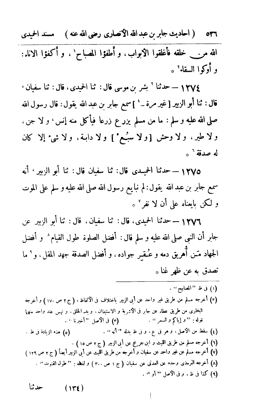 1274 - حدثنا بشر بن موسى قال ثنا الحميدي قال ثنا سفيان قال ثنا أبو الزبير غير مرة سمع جابر بن عبد الله يقول قال رسول الله صلى الله عليه و سلم : ما من مسلم يزرع زرعا فيأكل منه إنس ولا جن ولا طير ولا وحش ولا سبع ولا دابة ولا شيء إلا كان له صدقة
