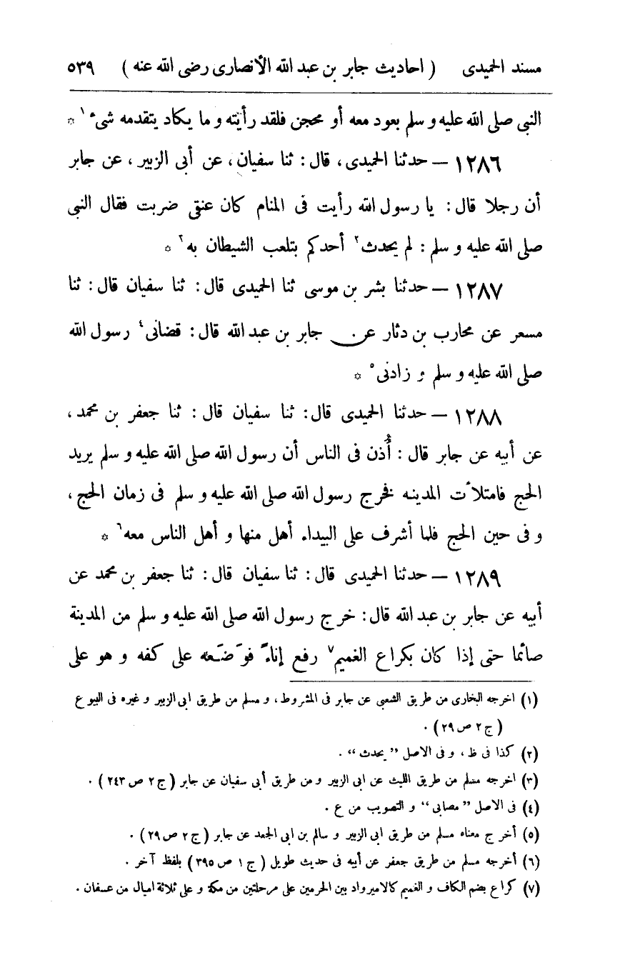 1287 - حدثنا بشر بن موسى ثنا الحميدي قال ثنا سفيان قال ثنا مسعر بن محارب بن دثار عن جابر عن عبد الله قال : قضاني رسول الله صلى الله عليه و سلم وزادني