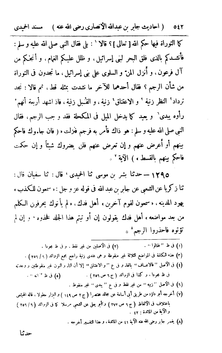1295 - حدثنا بشر بن موسى ثنا الحميدي قال ثنا سفيان قال ثنا زكريا عن الشعبي عن جابر بن عبد الله : في قوله عز و جل سمعون للكذب يهود المدينة سمعون لقوم آخرين أهل فدك لم يأتوك يحرفون الكلم من بعد مواضعه أهل فدك يقولون إن أوتيتم هذا الجلد فخذوه وإن لم تؤتوه فاحذروا الرجم