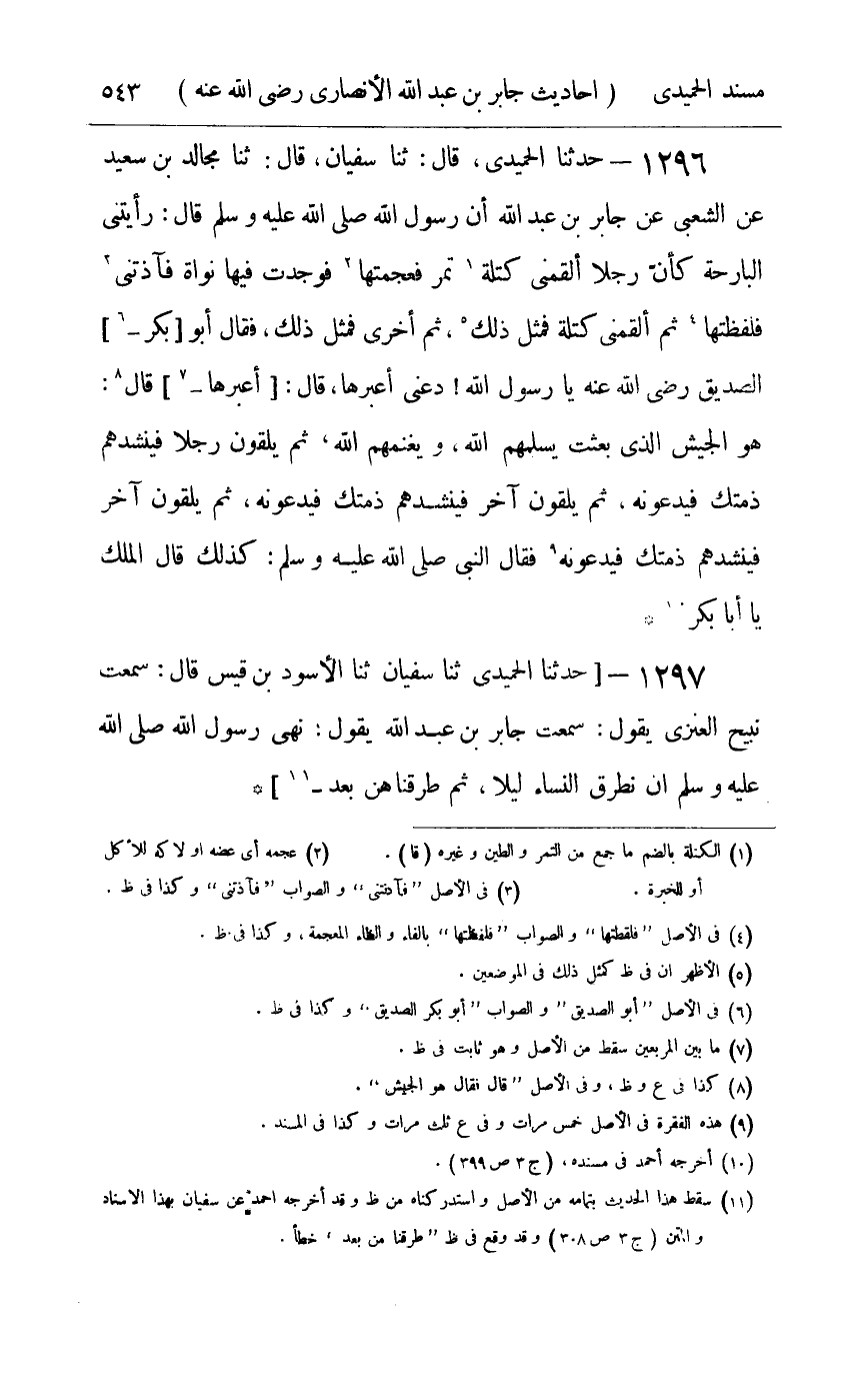 1296 - حدثنا الحميدي قال ثنا سفيان قال ثنا مجالد بن سعيد عن الشعبي عن جابر بن عبد الله أن رسول الله صلى الله عليه و سلم قال : رأيتني البارحة كأن رجلا ألقمني كتلة تمر فعجمتها فوجدت فيها نواة فآذني فلفظتها ثم ألقمني كتلة فمثل ذلك ثم أخرى فمثل ذلك فقال أبو بكر الصديق رضي الله عنه يا رسول الله دعني أعبرها قال أعبرها قال هو الجيش الذي بعثت يسلمهم الله ويغنمهم الله ثم يلقون رجلا فينشدهم ذمتك فيدعونه ثم يلقون آخر فينشدهم ذمتك فيدعونه ثم يلقون آخر فينشدهم ذمتك فيدعونه فقال النبي صلى الله عليه و سلم كذلك قال الملك يا أبا بكر