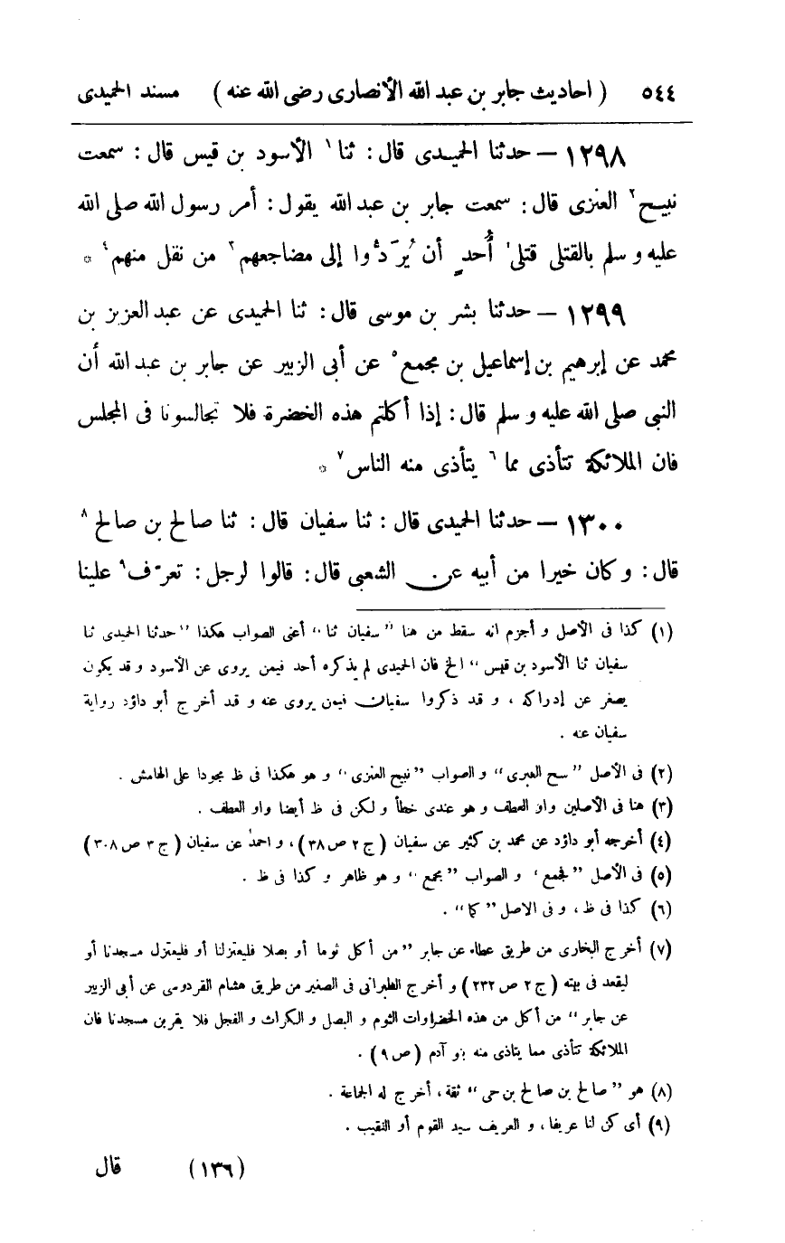 1299 - حدثنا بشر بن موسى قال ثنا الحميدي عن عبد العزيز بن محمد عن إبراهيم بن إسماعيل بن مجمع عن أبي الزبير عن جابر بن عبد الله أن النبي صلى الله عليه و سلم قال : إذا أكلتم هذه الخضرة فلا تجالسونا في المجلس فإن الملائكة تتأذى مما يتأذى منه الناس