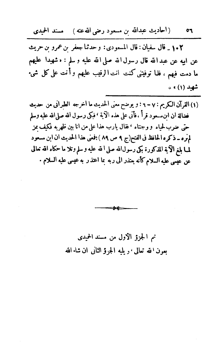 102 - قال سفيان قال المسعودي وحدثنا جعفر بن عمرو بن حريث عن أبيه عن عبد الله قال رسول الله صلى الله عليه و سلم : شهيدا عليهم ما دمت فيهم فلما توفيتني كنت أنت الرقيب عليهم وأنت على كل شيء شهيد [ ص 57 ] من مسند أبي بكر عبد الله بن الزبير الحميدي