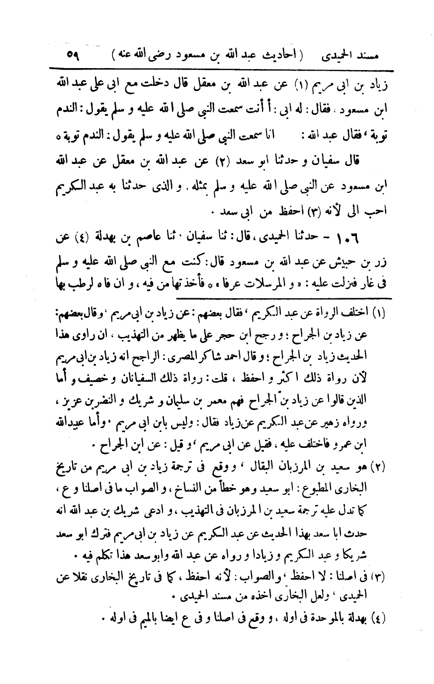 106 - حدثنا الحميدي قال ثنا سفيان ثنا عاصم بن بهدلة عن زر بن حبيش عن عبد الله بن مسعود قال : كنت مع النبي صلى الله عليه و سلم في غار فنزلت عليه والمرسلات عرفا فأخذتها من فيه وإن فاه لرطب بها فما أدري بأيتها ختم فبأي حديث بعده يؤمنون أو وإذا قيل لهم اركعوا لا يركعون قال فخرجت علينا حية من حجر فأفلتتنا ودخلت جحرا آخر فقال النبي صلى الله عليه و سلم لقد وقيتم شرها ووقيت شركم