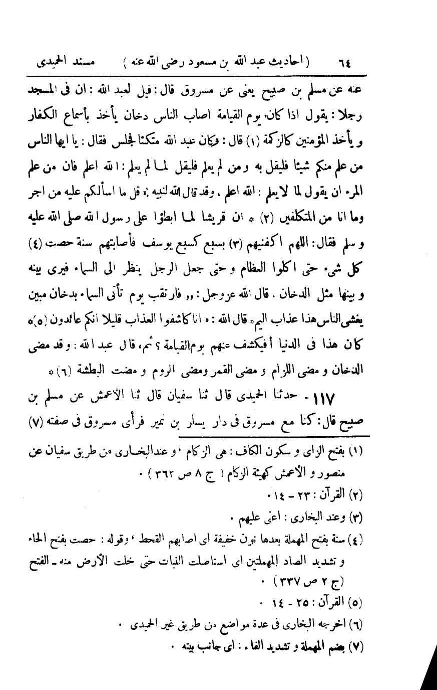 117 - حدثنا الحميدي قال ثنا سفيان قال ثنا الأعمش عن مسلم بن صبيح قال كنا مع مسروق في دار يسار بن نمير فرأى مسروق في صفته تماثيل فقال سمعت عبد الله بن مسعود يقول سمعت رسول الله صلى الله عليه و سلم يقول : إن أشد الناس عذابا يوم القيامة المصورون