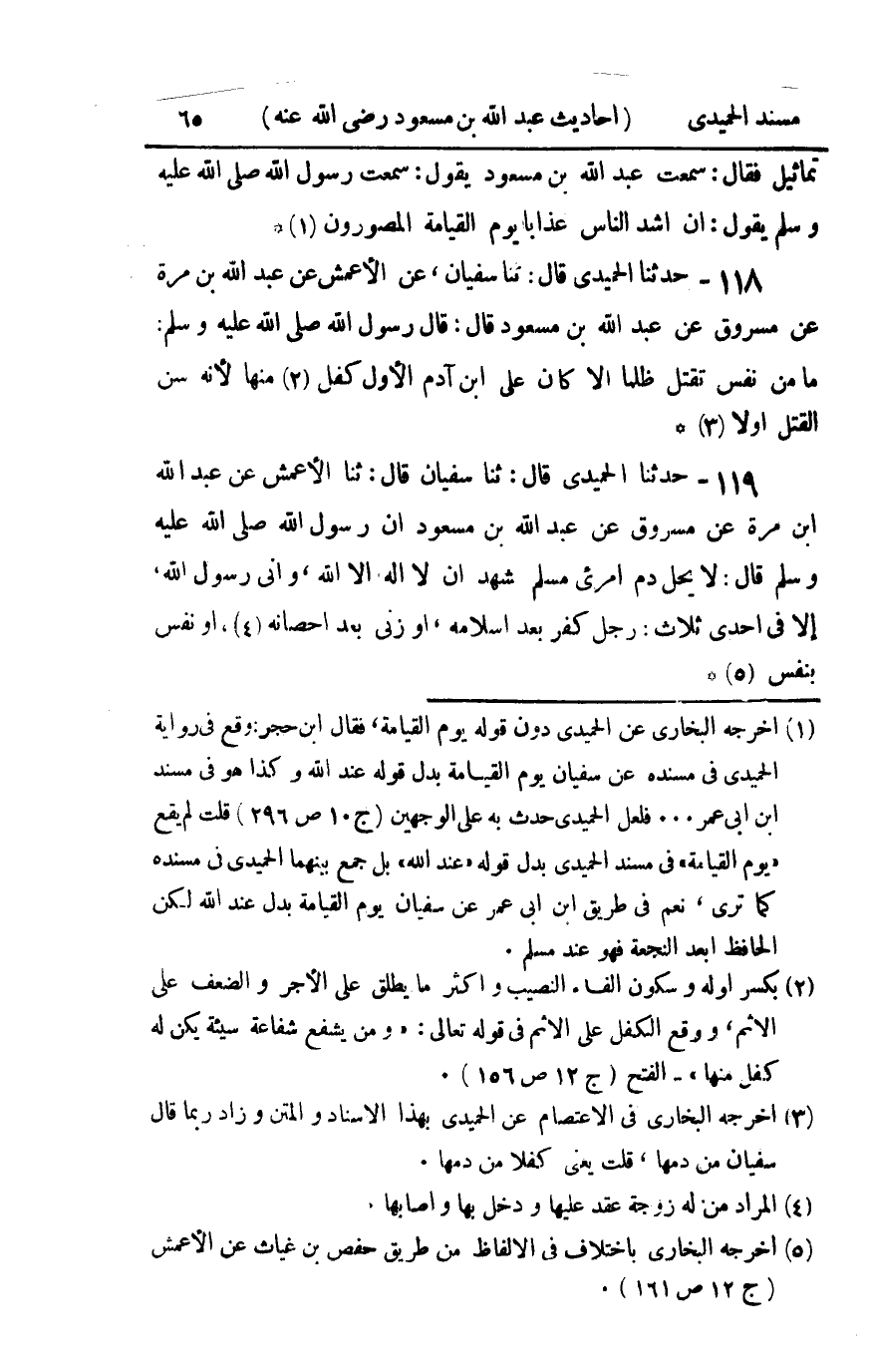 119 - حدثنا الحميدي قال ثنا سفيان قال ثنا الأعمش عن عبد الله بن مرة عن مسروق عن عبد الله بن مسعود أن رسول الله صلى الله عليه و سلم قال : لا يحل دم امرئ مسلم شهد أن لا إله إلا الله وأني رسول الله إلا في إحدى ثلاث رجل كفر بعد إسلامه أو زنى بعد إحصانه أو نفس بنفس