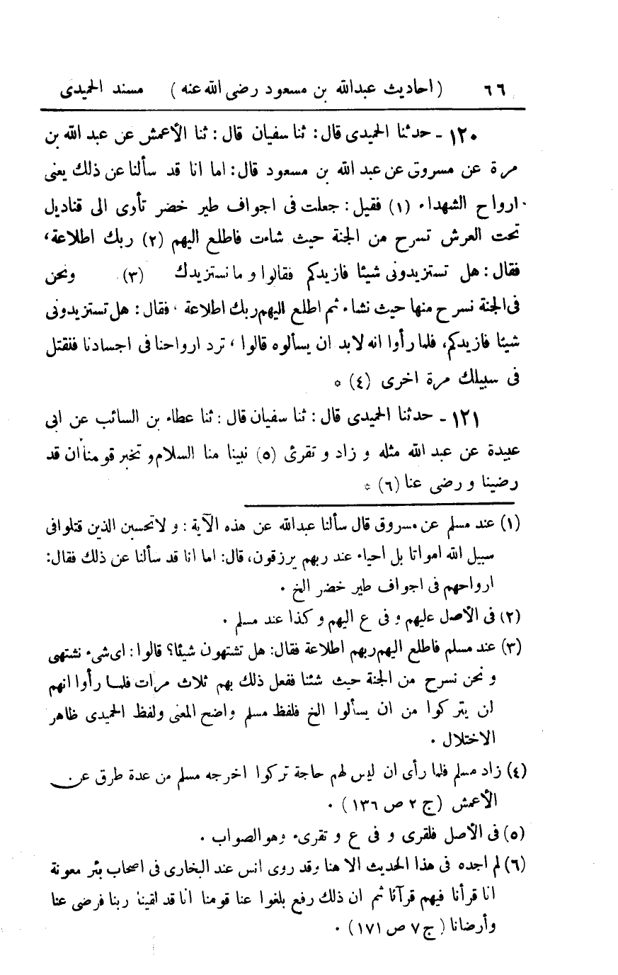 120 - حدثنا الحميدي قال ثنا سفيان قال ثنا الأعمش عن عبد الله بن مرة عن مسروق عن عبد الله بن مسعود قال : أما أنا قد سألنا عن ذلك يعني أرواح الشهداء فقيل جعلت في أجواف طير خضر تأوي إلى قناديل تحت العرش تسرح من الجنة حيث شاءت فاطلع إليهم ربك إطلاعه فقال هل تستزيدوني شيئا فأزيدكم فقالوا وما نستزيدك ونحن في الجنة نسرح منها حيث نشاء ثم اطلع إليهم ربك إطلاعه فقال هل تستزيدوني شيئا فأزيدكم فلما رأوا أنه لا بد أن يسألوه قالوا ترد أرواحنا في أجسادنا فنقتل في سبيلك مرة أخرى