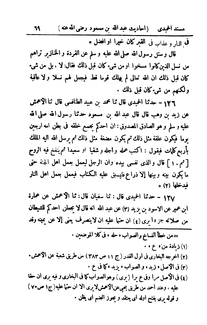 126 - حدثنا الحميدي قال ثنا محمد بن عبيد الطنافسي قال ثنا الأعمش عن زيد بن وهب قال قال عبد الله بن مسعود : حدثنا رسول الله صلى الله عليه و سلم وهو الصادق المصدوق إن أحدكم يجمع خلقه في بطن أمه أربعين يوما فيكون علقة مثل ذلك ثم يكون مضغة مثل ذلك ثم يرسل الله إليه الملك بأربع كلمات فيقول أكتب عمله وأجله وشقيا أو سعيدا ثم ينفخ فيه الروح ثم قال والذي نفسي بيده وإن الرجل ليعمل بعمل أهل الجنة حتى ما يكون بينه وبينها إلا ذراع فليسبق عليه الكتاب فيعمل بعمل أهل النار فيدخلها