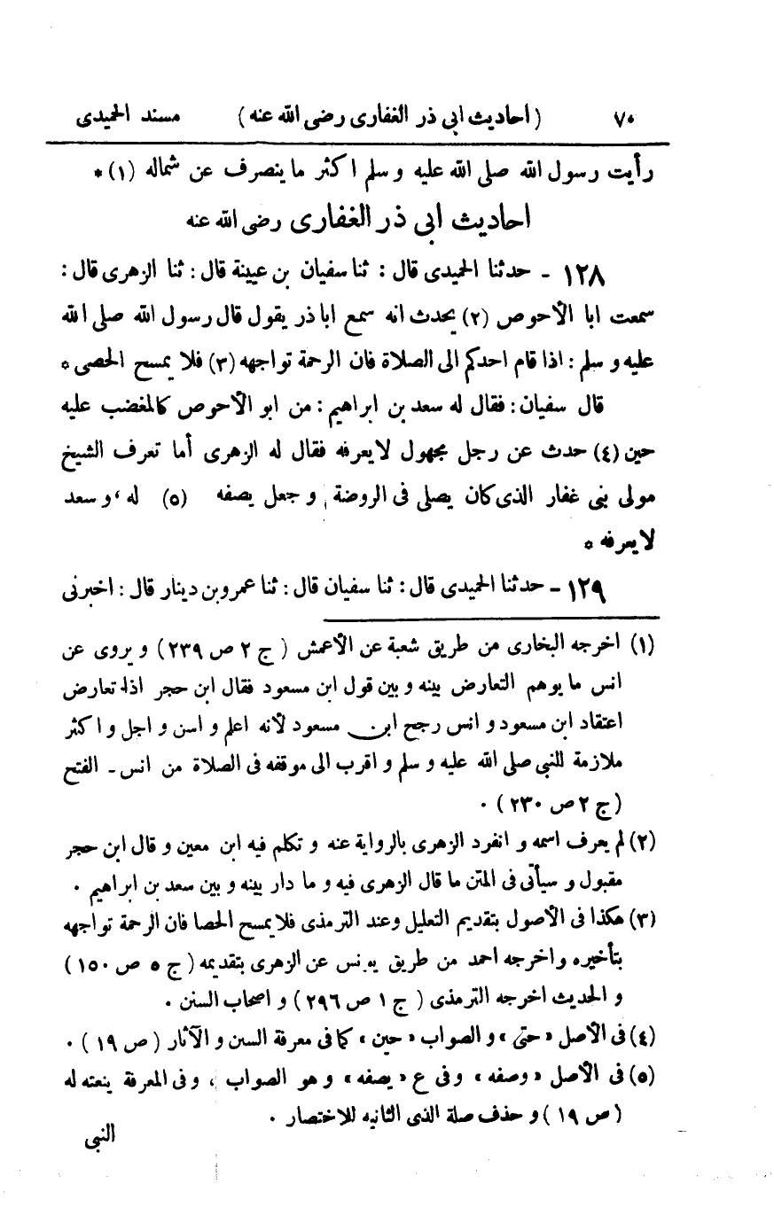 128 - حدثنا الحميدي قال ثنا سفيان بن عيينة قال ثنا الزهري قال سمعت أبا الأحوص يحدث أنه سمع أبا ذر يقول قال رسول الله صلى الله عليه و سلم : إذا قام أحدكم إلى الصلاة فإن الرحمة تواجهه فلا يمسح الحصى قال سفيان فقال له سعد بن إبراهيم من أبو الأحوص كالمغضب عليه حين حدث عن رجل مجهول لا يعرفه فقال له الزهري أما تعرف الشيخ مولى بني غفار الذي كان يصلي في الروضة وجعل يصفه له وسعد لا يعرفه