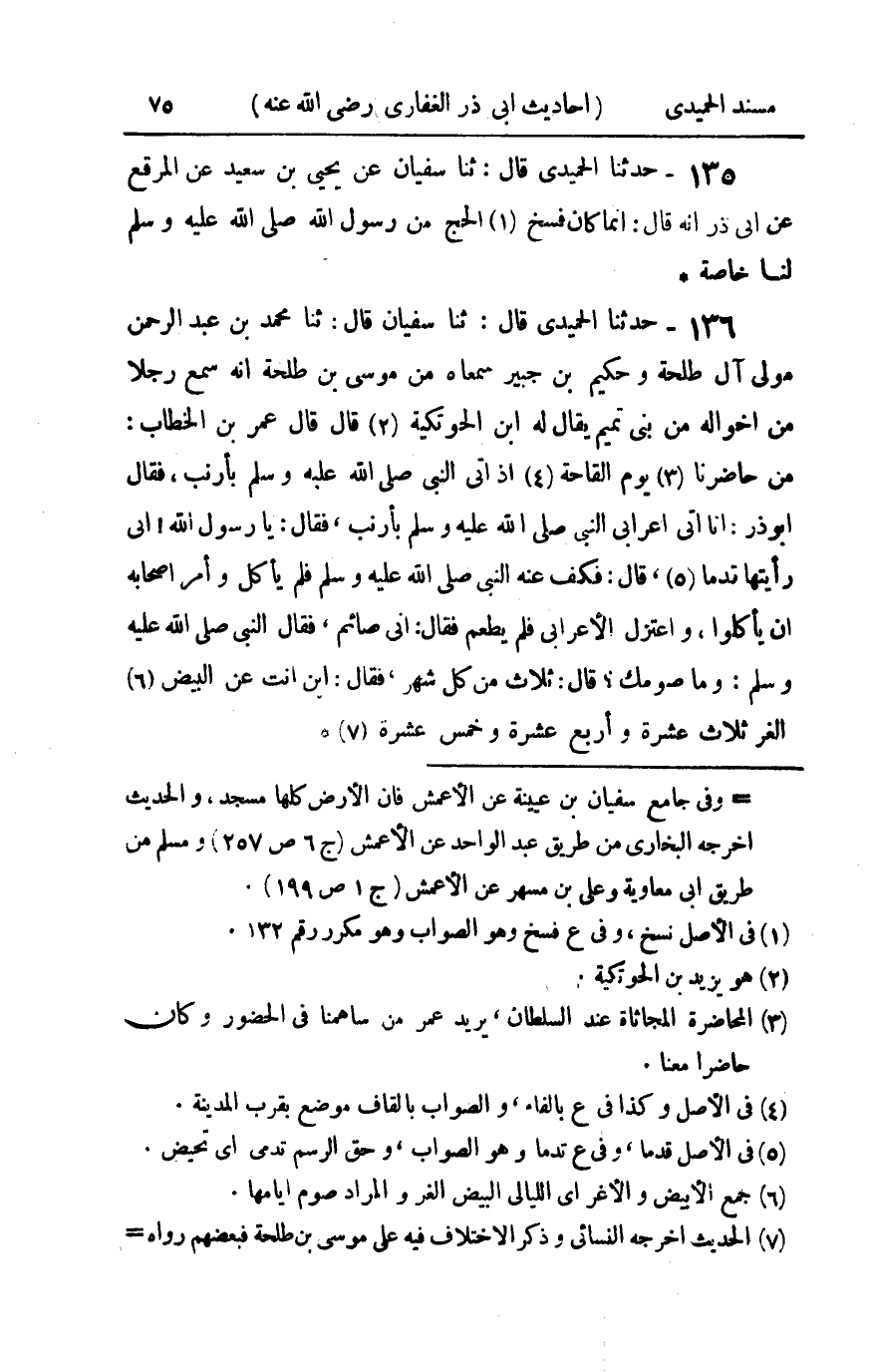 136 - حدثنا الحميدي قال ثنا سفيان قال ثنا محمد بن عبد الرحمن مولى آل طلحة وحكيم بن جبير سمعاه من موسى بن طلحة أنه سمع رجلا من أخواله من بني تميم يقال له بن الحوتكية قال قال عمر بن الخطاب : من حاضرنا يوم القاحة إذ أتى النبي صلى الله عليه و سلم بأرنب فقال أبو ذر إنا أتى أعرابي النبي صلى الله عليه و سلم بأرنب فقال يا رسول الله إني رأيتها تدما قال فكف عنه النبي صلى الله عليه و سلم فلم يأكل وأمر أصحابه أن يأكلوا واعتزل الأعرابي فلم يطعم فقال إني صائم فقال النبي صلى الله عليه و سلم وما صومك قال ثلاث من كل شهر فقال أين أنت عن البيض الغر ثلاث عشرة وأربع عشرة وخمس عشرة