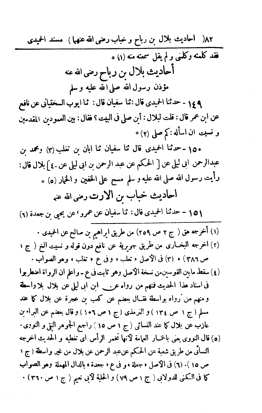 150 - حدثنا الحميدي قال ثنا سفيان ثنا أبان بن تغلب ومحمد بن عبد الرحمن أبي ليلى عن الحكم عن عبد الرحمن بن أبي ليلى عن بلال قال : رأيت رسول الله صلى الله عليه و سلم مسح على الخفين والخمار