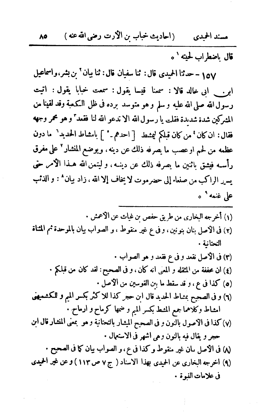 157 - حدثنا الحميدي قال ثنا سفيان قال ثنا بيان بن بشر وإسماعيل بن أبي خالد قالا سمعنا قيسا يقول سمعت خبابا يقول : أتيت رسول الله صلى الله عليه و سلم وهو متوسد بردة في ظل الكعبة وقد لقينا من المشركين شدة شديدة فقلت يا رسول الله ألا تدعو الله لنا فقعد وهو محمر وجهه فقال إن كان من كان قبلكم ليمشط أحدهم بأمشاط الحديد ما دون عظمه من لحم أو عصب ما يصرفه ذلك عن دينه ويوضع المنشار على مفرق رأسه فيشق باثنين ما يصرفه ذلك عن دينه وليتمن الله هذا الأمر حتى يسير الراكب من صنعاء إلى حضرموت لا يخاف إلا الله زاد بيان والذئب على غنمه