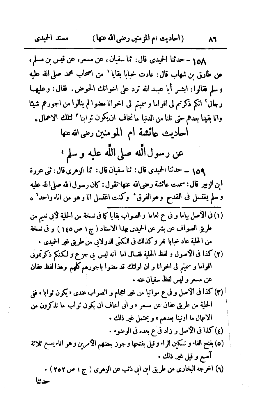 159 - حدثنا الحميدي قال ثنا سفيان قال ثنا الزهري قال ثنا عروة بن الزبير قال سمعت عائشة رضي الله عنها تقول : كان رسول الله صلى الله عليه و سلم يغتسل في القدح وهو الفرق وكنت أغتسل أنا وهو من إناء واحد