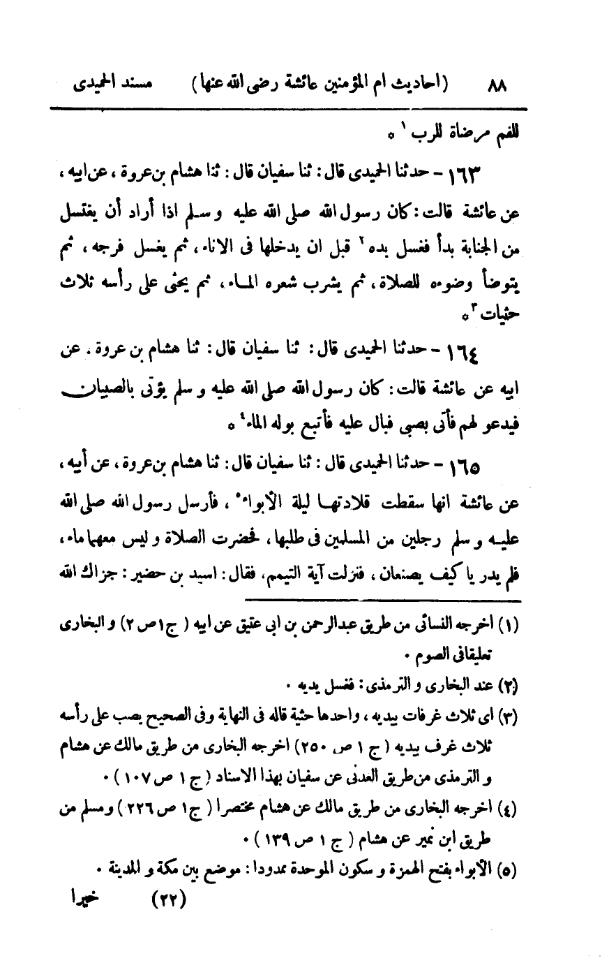 165 - حدثنا الحميدي قال ثنا سفيان قال ثنا هشام بن عورة عن أبيه عن عائشة أنها : سقطت قلادتها ليلة الأبواء فأرسل رسول الله صلى الله عليه و سلم رجلين من المسلمين في طلبها فحضرت الصلاة وليس معهما ماء فلم يدريا كيف يصنعان فنزلت آية التيمم فقال أسيد بن حضير جزاك الله خيرا ما نزل بك أمر قط فكرهته إلا جعل الله لك مخرجا وجعل للمسلمين فيه خيرا