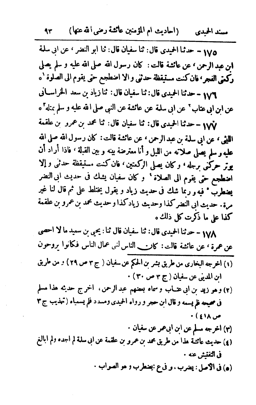 177 - حدثنا الحميدي قال ثنا سفيان قال ثنا محمد بن عمرو بن علقمة الليثي عن أبي سلمة بن عبد الرحمن عن عائشة قالت : كان رسول الله صلى الله عليه و سلم يصلي صلاته من الليل وأنا معترضة بينه وبين القبلة فإذا أراد أن يوتر حركني برجله وكان يصلي الركعتين فإن كنت مستيقظة حدثني وإلا اضطجع حتى يقوم إلى الصلاة وكان سفيان يشك في حديث أبي النضر يضطرب فيه وربما شك في حديث زياد ويقول يختلط علي ثم قال لنا غير مرة حديث أبي النضر كذا وحديث زياد كذا وحديث محمد بن عمرو بن علقمة كذا على ما ذكرت كل ذلك