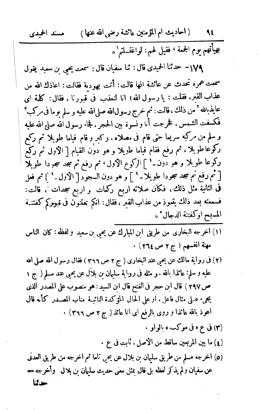 179 - حدثنا الحميدي قال ثنا سفيان قال سمعت يحيى بن سعيد يقول سمعت عمرة تحدث عن عائشة أنها قالت أتت يهودية فقالت : أعاذك الله من عذاب القبر فقلت يا رسول الله إنا لنعذب في قبورنا فقال كلمة أي عايذ بالله من ذلك قالت ثم خرج رسول الله صلى الله عليه و سلم يوما في مركب فكسفت الشمس فخرجت أنا ونسوة بين الحجر فجاء رسول الله صلى الله عليه و سلم من مركبه سريعا حتى قام في مصلاه وكبر وقام قياما طويلا ثم ركع ركوعا طويلا ثم رفع فقام قياما طويلا وهو دون القيام الأول ثم ركع ركوعا طويلا وهو دون الركوع الأول ثم رفع ثم سجد سجودا طويلا ثم رفع ثم سجد سجودا طويلا وهو دون السجود الأول ثم فعل في الثانية مثل ذلك فكان صلاته أربع ركعات وأربع سجدات قالت فسمعته بعد ذلك يتعوذ من عذاب القبر فقال إنكم تفتنون في قبوركم كفتنة المسيح أو كفتنة الدجال