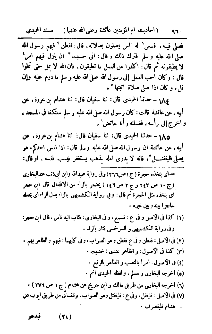184 - حدثنا الحميدي قال ثنا سفيان قال ثنا هشام بن عروة عن أبيه عن عائشة قالت : كان رسول الله صلى الله عليه و سلم معتكفا في المسجد وأخرج إلي رأسه فغسلته وأنا حائض