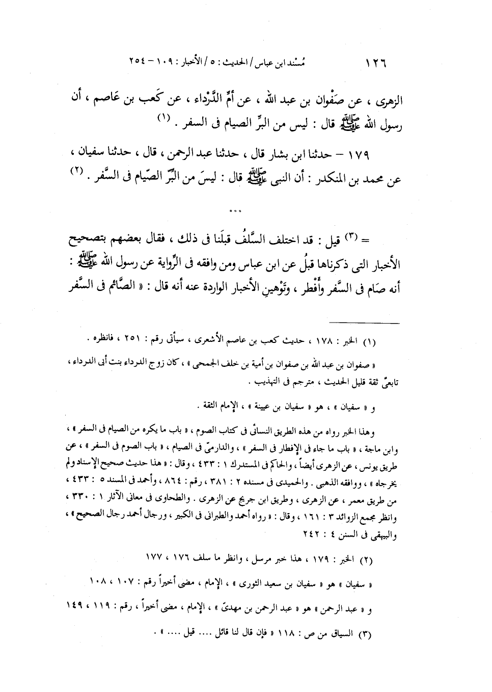 179 - حَدَّثَنَا ابْنُ بَشَّارٍ، قَالَ: حَدَّثَنَا عَبْدُ الرَّحْمَنِ، قَالَ: حَدَّثَنَا سُفْيَانُ، عَنْ مُحَمَّدِ بْنِ الْمُنْكَدِرِ أَنَّ النَّبِيَّ صَلَّى اللهُ عَلَيْهِ وَسَلَّمَ قَالَ: «§لَيْسَ مِنَ الْبِرِّ الصِّيَامُ فِي السَّفَرِ» قِيلَ: قَدِ اخْتَلَفَ السَّلَفُ قَبْلَنَا فِي ذَلِكَ، فَقَالَ بَعْضُهُمْ بِتَصْحِيحِ الْأَخْبَارِ الَّتِي ذَكَرْنَاهَا قَبْلُ عَنِ ابْنِ عَبَّاسٍ وَمَنْ وَافَقَهُ فِي الرِّوَايَةِ عَنْ رَسُولِ اللَّهِ صَلَّى اللهُ عَلَيْهِ وَسَلَّمَ أَنَّهُ صَامَ فِي السَّفَرِ وَأَفْطَرَ، وَتَوْهِينِ الْأَخْبَارِ الْوَارِدَةِ عَنْهُ أَنَّهُ قَالَ: «الصَّائِمُ فِي السَّفَرِ -[127]- كَالْمُفْطِرِ فِي الْحَضَرِ» ، وَأَنَّهُ قَالَ: «لَيْسَ مِنَ الْبِرِّ الصَّوْمُ فِي السَّفَرِ»