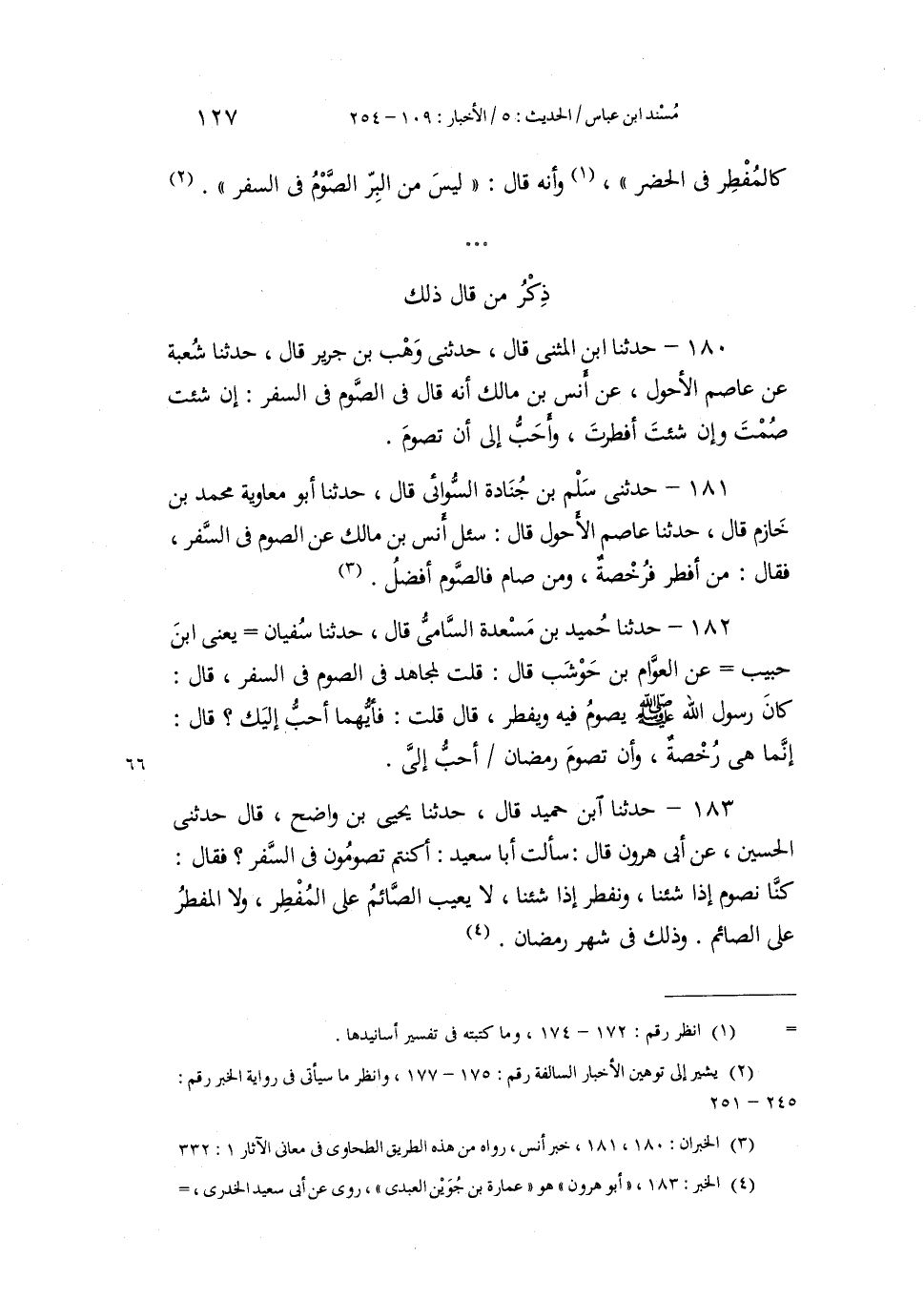 181 - حَدَّثَنِي سَلْمُ بْنُ جُنَادَةَ السُّوَائِيُّ، قَالَ: حَدَّثَنَا أَبُو مُعَاوِيَةَ مُحَمَّدُ بْنُ خَازِمٍ، قَالَ: حَدَّثَنَا عَاصِمٌ الْأَحْوَلُ، قَالَ: سُئِلَ أَنَسُ بْنُ مَالِكٍ عَنِ الصَّوْمِ فِي السَّفَرِ، فَقَالَ: «§مَنْ أَفْطَرَ فَرُخْصَةٌ، وَمَنْ صَامَ فَالصَّوْمُ أَفْضَلُ»