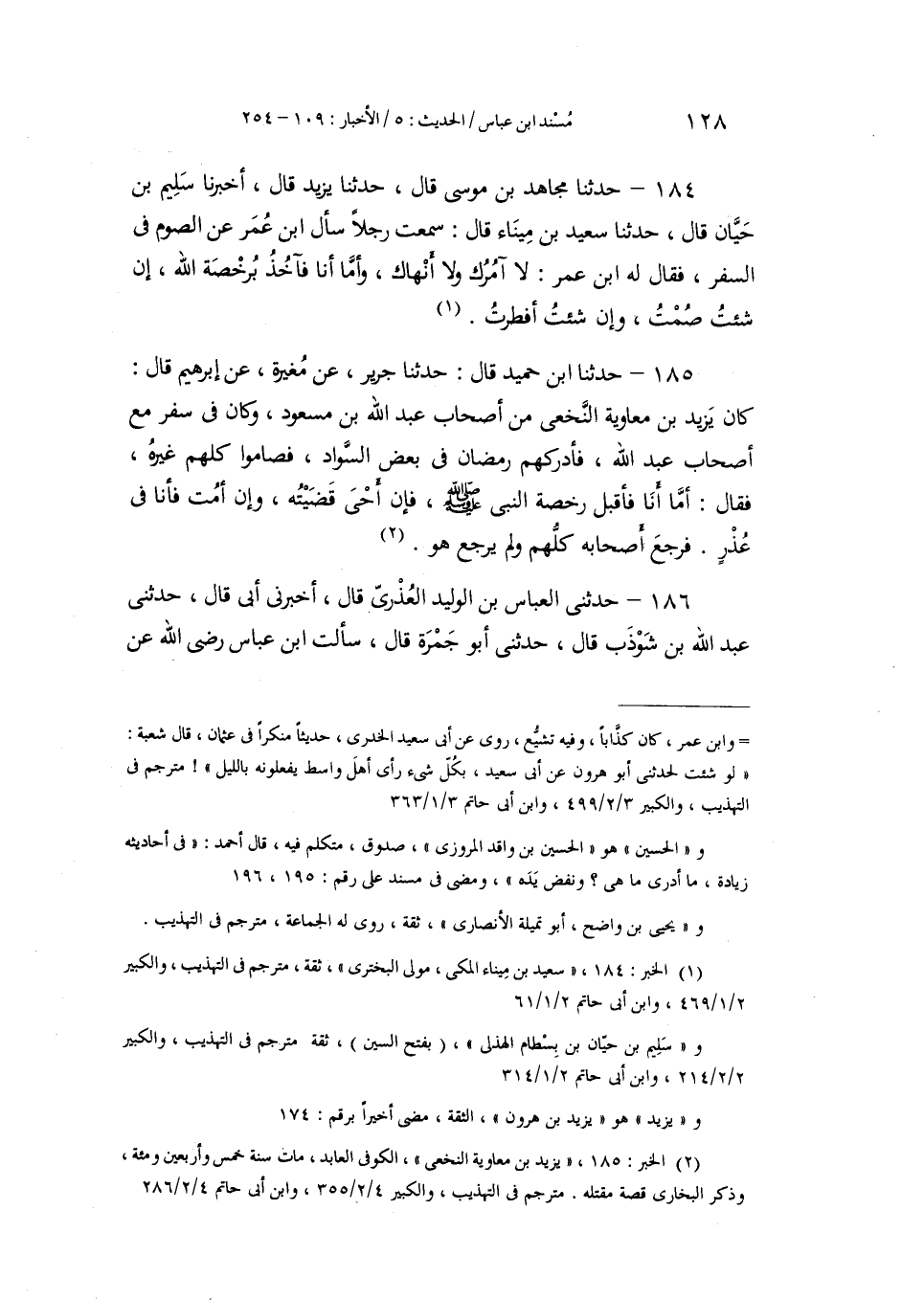 185 - حَدَّثَنَا ابْنُ حُمَيْدٍ، قَالَ: حَدَّثَنَا جَرِيرٌ، عَنْ مُغِيرَةَ، عَنْ إِبْرَاهِيمَ، قَالَ: كَانَ يَزِيدُ بْنُ مُعَاوِيَةَ النَّخَعِيُّ مِنْ أَصْحَابِ عَبْدِ اللَّهِ بْنِ مَسْعُودٍ، وَكَانَ فِي سَفَرٍ مَعَ أَصْحَابِ عَبْدِ اللَّهِ، فَأَدْرَكَهُمْ رَمَضَانُ فِي بَعْضِ السَّوَادِ، فَصَامُوا كُلُّهُمْ غَيْرُهُ، فَقَالَ: أَمَّا أَنَا فَأَقْبَلُ «§رُخْصَةَ النَّبِيِّ صَلَّى اللهُ عَلَيْهِ وَسَلَّمَ، فَإِنْ أَحْيَ قَضَيْتُهُ، وَإِنْ أَمُتْ فَأَنَا فِي عُذْرٍ» . فَرَجَعَ أَصْحَابُهُ كُلُّهُمْ وَلَمْ يَرْجِعْ هُوَ
