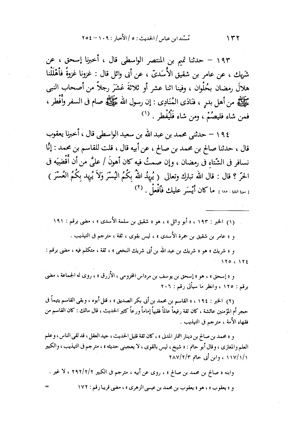 194 - حَدَّثَنِي مُحَمَّدُ بْنُ عَبْدِ اللَّهِ بْنِ سَعِيدٍ الْوَاسِطِيُّ، قَالَ: أَخْبَرَنَا يَعْقُوبُ، قَالَ: حَدَّثَنَا صَالِحُ بْنُ مُحَمَّدِ بْنِ صَالِحٍ، عَنْ أَبِيهِ، قَالَ: قُلْتُ لِلْقَاسِمِ بْنِ مُحَمَّدٍ: إِنَّا §نُسَافِرُ فِي الشِّتَاءِ فِي رَمَضَانَ، وَإِنْ صُمْتُ فِيهِ كَانَ أَهْوَنُ عَلَيَّ مِنْ أَنْ أَقْضِيَهُ فِي الْحَرِّ؟ قَالَ: " قَالَ اللَّهُ تَبَارَكَ وَتَعَالَى: {يُرِيدُ اللَّهُ بِكُمُ الْيُسْرَ وَلَا يُرِيدُ بِكُمُ الْعُسْرَ} [البقرة: 185] مَا كَانَ أَيْسَرُ عَلَيْكَ فَافْعَلْ "