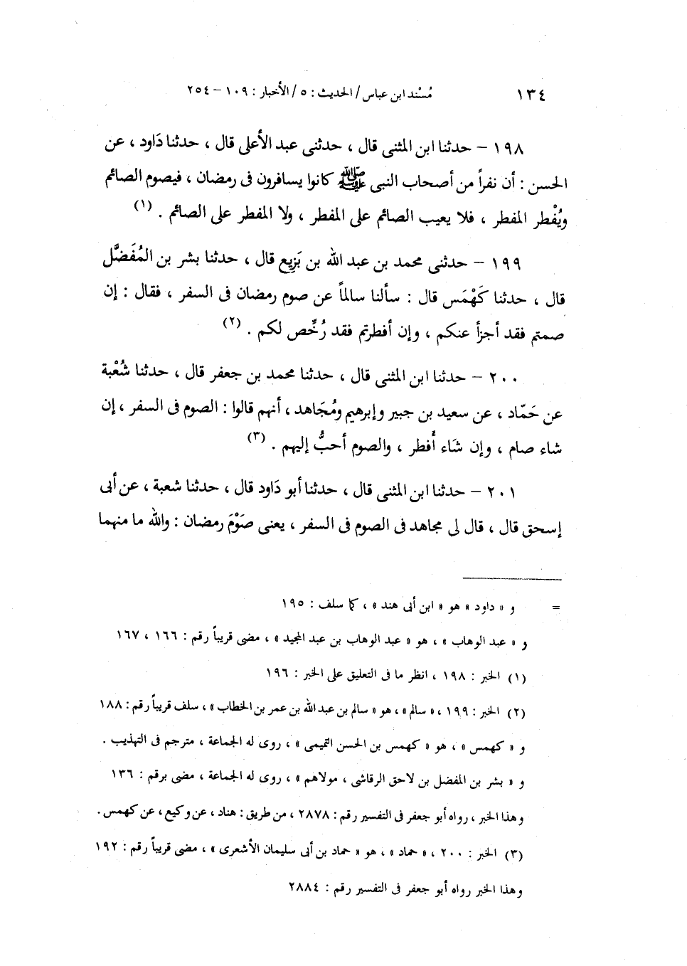198 - حَدَّثَنَا ابْنُ الْمُثَنَّى، قَالَ: حَدَّثَنِي عَبْدُ الْأَعْلَى، قَالَ: حَدَّثَنَا دَاوُدُ، عَنِ الْحَسَنِ «أَنَّ نَفَرًا مِنْ أَصْحَابِ النَّبِيِّ صَلَّى اللهُ عَلَيْهِ وَسَلَّمَ §كَانُوا يُسَافِرُونَ فِي رَمَضَانَ، فَيَصُومُ الصَّائِمُ وَيُفْطِرُ الْمُفْطِرُ، فَلَا يَعِيبُ الصَّائِمُ عَلَى الْمُفْطِرِ، وَلَا الْمُفْطِرُ عَلَى الصَّائِمِ»