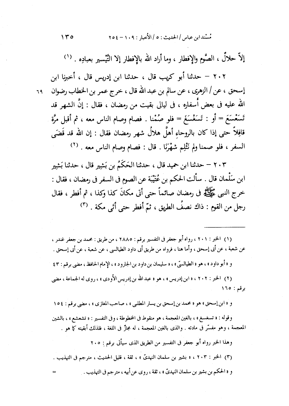 203 - حَدَّثَنَا ابْنُ حُمَيْدٍ، قَالَ: حَدَّثَنَا الْحَكَمُ بْنُ بَشِيرٍ، قَالَ: حَدَّثَنَا بَشِيرُ بْنُ سَلْمَانَ، قَالَ: سَأَلْتُ الْحَكَمَ بْنَ عُتَيْبَةَ عَنِ الصَّوْمِ فِي السَّفَرِ فِي رَمَضَانَ، فَقَالَ: «§خَرَجَ النَّبِيُّ صَلَّى اللهُ عَلَيْهِ وَسَلَّمَ فِي رَمَضَانَ صَائِمًا حَتَّى أَتَى مَكَانَ كَذَا وَكَذَا، ثُمَّ أَفْطَرَ» ، فَقَالَ رَجُلٌ مِنَ الْقَوْمِ: ذَاكَ نِصْفُ الطَّرِيقِ، ثُمَّ أَفْطَرَ حَتَّى أَتَى مَكَّةَ