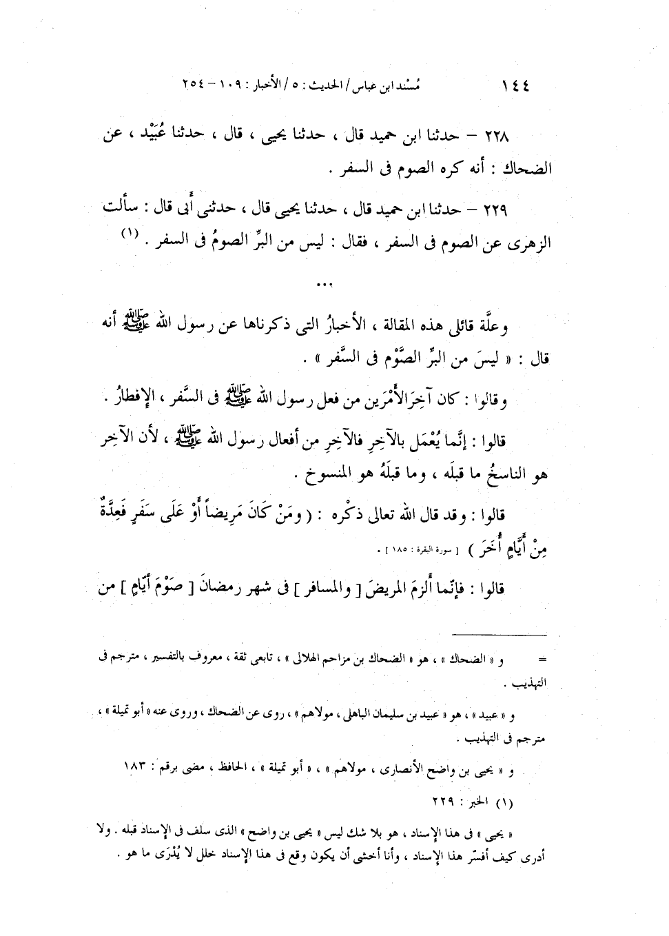228 - حَدَّثَنَا ابْنُ حُمَيْدٍ، قَالَ: حَدَّثَنَا يَحْيَى، قَالَ: حَدَّثَنَا عُبَيْدٌ، عَنِ الضَّحَّاكِ أَنَّهُ «§كَرِهَ الصَّوْمَ فِي السَّفَرِ»