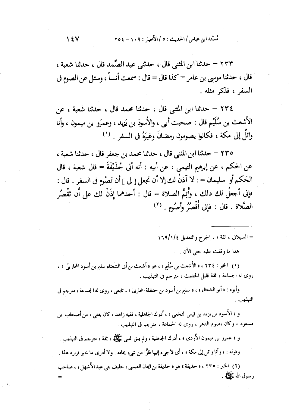 235 - حَدَّثَنَا ابْنُ الْمُثَنَّى، قَالَ: حَدَّثَنَا مُحَمَّدُ بْنُ جَعْفَرٍ، قَالَ: حَدَّثَنَا شُعْبَةُ، عَنِ الْحَكَمِ، عَنْ إِبْرَاهِيمَ التَّيْمِيِّ، عَنْ أَبِيهِ، أَنَّهُ أَتَى حُذَيْفَةَ، قَالَ شُعْبَةُ: قَالَ: الْحَكَمُ أَوْ سُلَيْمَانُ: §لَا آذَنُ لَكَ إِلَّا أَنْ تَجْعَلَ لِي أَنْ تَصُومَ فِي السَّفَرِ، قَالَ: فَإِنِّي أَجْعَلُ لَكَ ذَلِكَ، وَأُتِمُّ الصَّلَاةَ، قَالَ أَحَدُهُمَا: إِذَنْ لَكَ عَلَى أَنْ تَقْصُرَ الصَّلَاةَ، قَالَ: فَإِنِّي أَقْصُرُ وَأَصُومُ