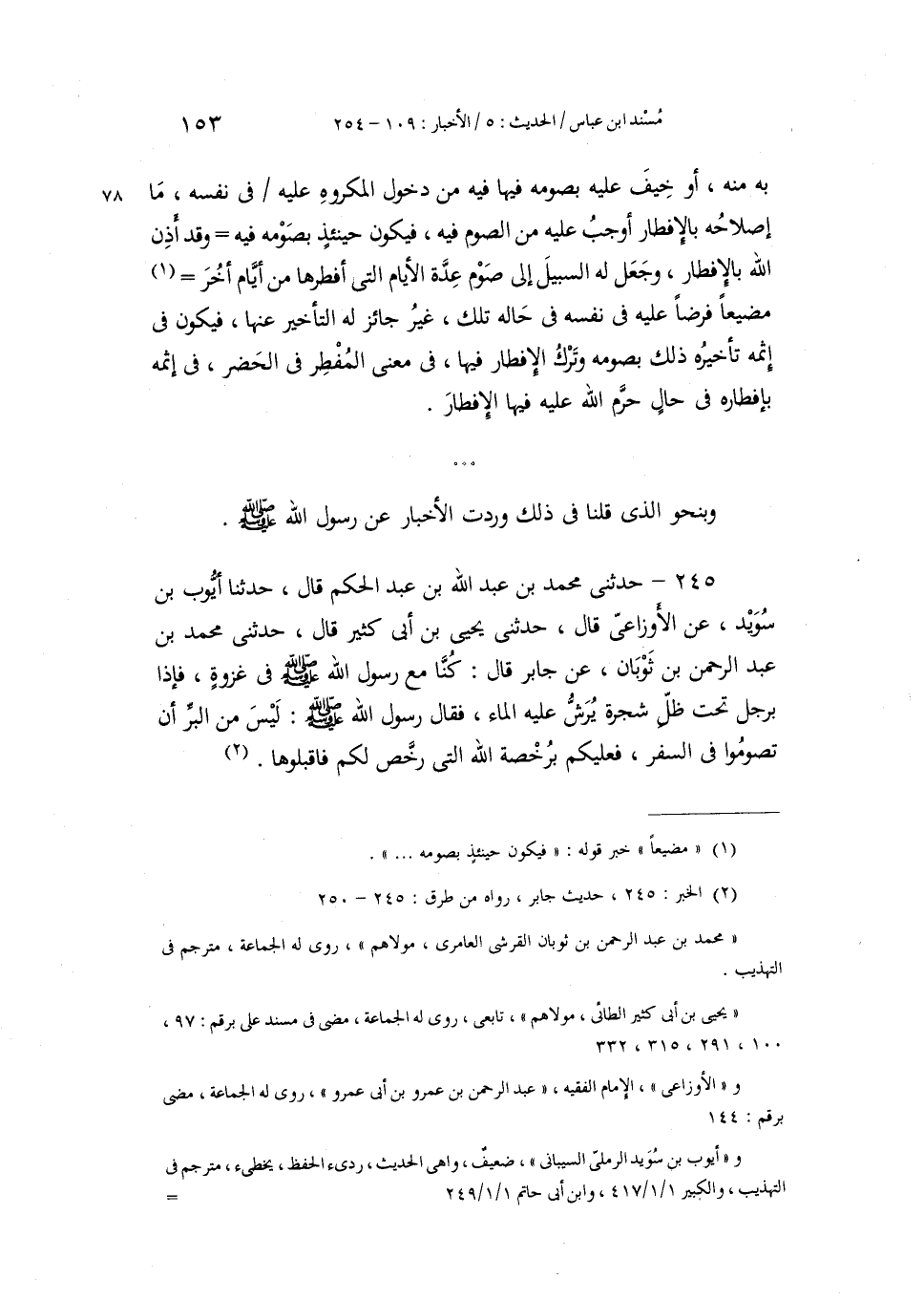 245 - حَدَّثَنِي مُحَمَّدُ بْنُ عَبْدِ اللَّهِ بْنِ عَبْدِ الْحَكَمِ، قَالَ: حَدَّثَنَا أَيُّوبُ بْنُ سُوَيْدٍ، عَنِ الْأَوْزَاعِيِّ، قَالَ: حَدَّثَنِي يَحْيَى بْنُ أَبِي كَثِيرٍ، قَالَ: حَدَّثَنِي مُحَمَّدُ بْنُ عَبْدِ الرَّحْمَنِ بْنِ ثَوْبَانَ، عَنْ جَابِرٍ، قَالَ: كُنَّا مَعَ رَسُولِ اللَّهِ صَلَّى اللهُ عَلَيْهِ وَسَلَّمَ فِي غَزْوَةٍ، فَإِذَا بِرَجُلٍ تَحْتَ ظِلِّ شَجَرَةٍ يُرَشُّ عَلَيْهِ الْمَاءُ، فَقَالَ رَسُولُ اللَّهِ صَلَّى اللهُ عَلَيْهِ وَسَلَّمَ: «§لَيْسَ مِنَ الْبِرِّ أَنْ تَصُومُوا فِي السَّفَرِ، فَعَلَيْكُمْ بِرُخْصَةِ اللَّهِ الَّتِي رَخَّصَ لَكُمْ فَاقْبَلُوهَا»