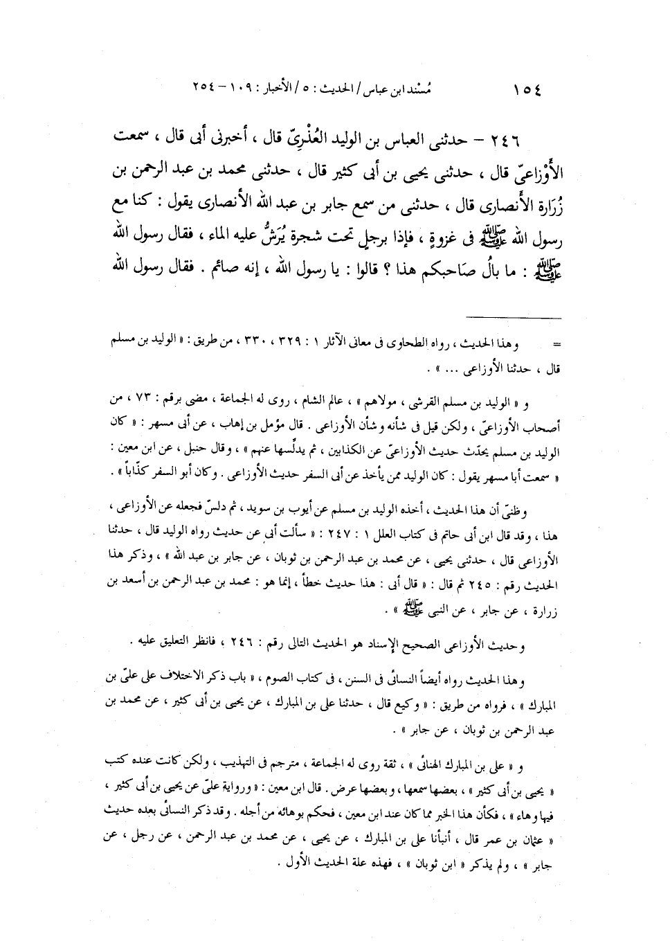 246 - حَدَّثَنِي الْعَبَّاسُ بْنُ الْوَلِيدِ الْعُذْرِيُّ، قَالَ: أَخْبَرَنِي أَبِي قَالَ: سَمِعْتُ الْأَوْزَاعِيَّ، قَالَ: حَدَّثَنِي يَحْيَى بْنُ أَبِي كَثِيرٍ، قَالَ: حَدَّثَنِي مُحَمَّدُ بْنُ عَبْدِ الرَّحْمَنِ بْنِ زُرَارَةَ الْأَنْصَارِيُّ، قَالَ: حَدَّثَنِي مَنْ سَمِعَ جَابِرَ بْنَ عَبْدِ اللَّهِ الْأَنْصَارِيَّ يَقُولُ: كُنَّا مَعَ رَسُولِ اللَّهِ صَلَّى اللهُ عَلَيْهِ وَسَلَّمَ فِي غَزْوَةٍ، فَإِذَا بِرَجُلٍ تَحْتَ شَجَرَةٍ يُرَشُّ عَلَيْهِ الْمَاءُ، فَقَالَ رَسُولُ اللَّهِ صَلَّى اللهُ عَلَيْهِ وَسَلَّمَ: «§مَا بَالُ صَاحِبِكُمْ هَذَا؟» ، قَالُوا: يَا رَسُولَ اللَّهِ إِنَّهُ صَائِمٌ، فَقَالَ رَسُولُ اللَّهِ صَلَّى اللهُ عَلَيْهِ وَسَلَّمَ -[155]-: «لَيْسَ مِنَ الْبِرِّ أَنْ تَصُومُوا فِي السَّفَرِ، فَعَلَيْكُمْ بِرُخْصَةِ اللَّهِ الَّتِي رَخَّصَ لَكُمْ»