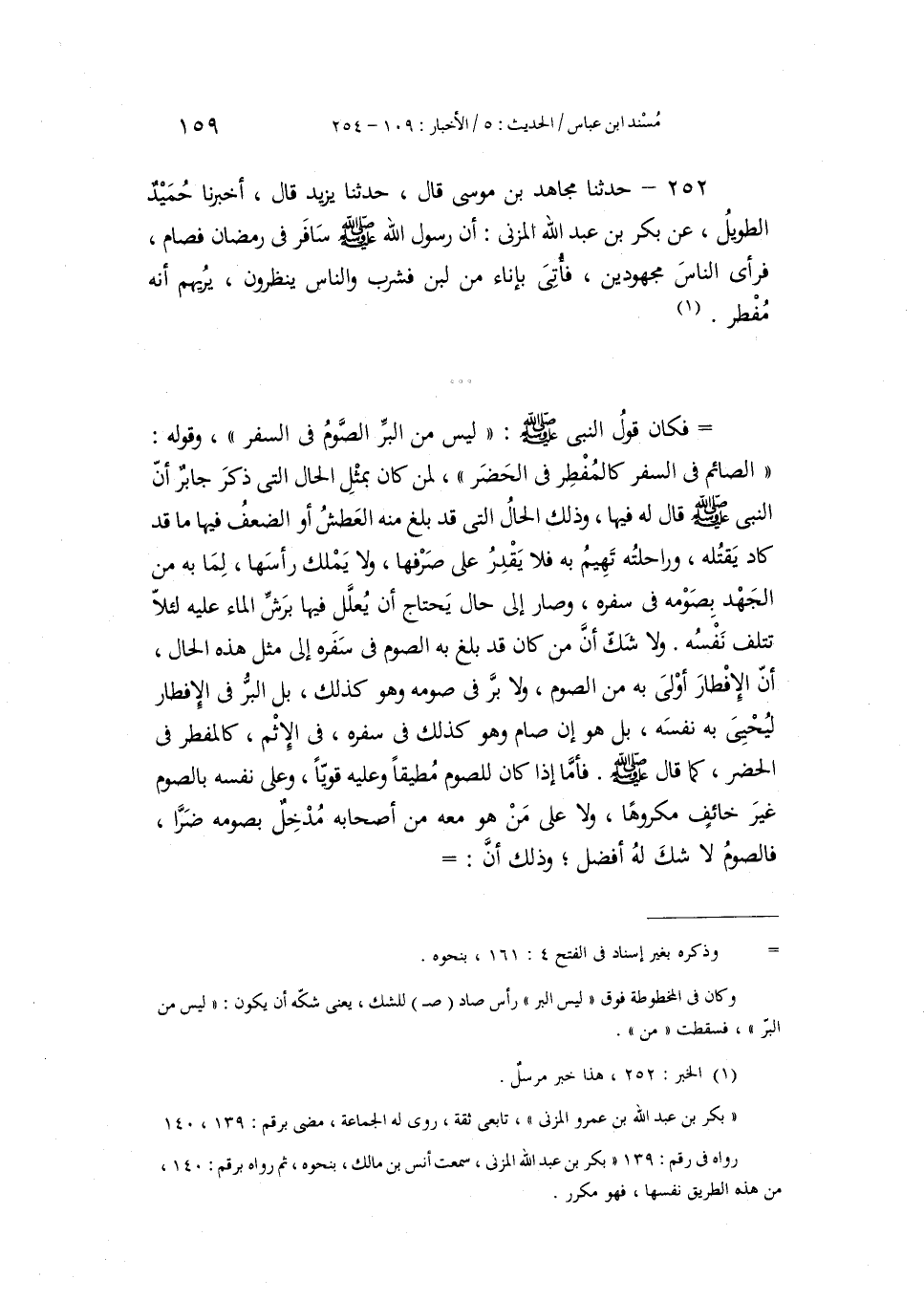 252 - حَدَّثَنَا مُجَاهِدُ بْنُ مُوسَى، قَالَ: حَدَّثَنَا يَزِيدُ، قَالَ: أَخْبَرَنَا حُمَيْدٌ الطَّوِيلُ، عَنْ بَكْرِ بْنِ عَبْدِ اللَّهِ الْمُزَنِيِّ أَنَّ رَسُولَ اللَّهِ صَلَّى اللهُ عَلَيْهِ وَسَلَّمَ «§سَافَرَ فِي رَمَضَانَ فَصَامَ، فَرَأَى النَّاسَ مَجْهُودِينَ، فَأُتِيَ بِإِنَاءٍ مِنْ لَبَنٍ فَشَرِبَ وَالنَّاسُ يَنْظُرُونَ، يُرِيَهُمْ أَنَّهُ مُفْطِرٌ» فَكَانَ قَوْلُ النَّبِيِّ صَلَّى اللهُ عَلَيْهِ وَسَلَّمَ: «لَيْسَ مِنَ الْبِرِّ الصَّوْمُ فِي السَّفَرِ» ، وَقَوْلُهُ: «الصَّائِمُ فِي السَّفَرِ كَالْمُفْطِرِ فِي الْحَضَرِ» ، لِمَنْ كَانَ بِمِثْلِ الْحَالِ الَّتِي ذَكَرَ جَابِرٌ أَنَّ النَّبِيَّ صَلَّى اللهُ عَلَيْهِ وَسَلَّمَ قَالَ لَهُ فِيهَا، وَذَلِكَ الْحَالُ الَّتِي قَدْ بَلَغَ مِنْهُ الْعَطَشُ أَوِ الضَّعْفُ فِيهَا مَا قَدْ كَادَ يَقْتُلُهُ، وَرَاحِلَتُهُ تَهِيمُ بِهِ فَلَا يَقْدِرُ عَلَى صَرْفِهَا، وَلَا يَمْلِكُ رَأْسَهَا، لِمَا بِهِ مِنَ الْجَهْدِ بِصَوْمِهِ فِي سَفَرِهِ، وَصَارَ إِلَى حَالٍ يَحْتَاجُ أَنْ يُعَلَّلَ فِيهَا بِرَشِّ الْمَاءِ عَلَيْهِ لِئَلَّا تَتْلَفَ نَفْسُهُ. وَلَا شَكَّ أَنَّ مَنْ كَانَ قَدْ بَلَغَ بِهِ الصَّوْمُ فِي سَفَرِهِ إِلَى مِثْلِ هَذِهِ الْحَالِ أَنَّ الْإِفْطَارَ أَوْلَى بِهِ مِنَ الصَّوْمِ، وَلَا بِرَّ فِي صَوْمِهِ وَهُوَ كَذَلِكَ، بَلِ الْبِرُّ فِي الْإِفْطَارِ لِيُحْيِيَ بِهِ نَفْسَهُ، بَلْ هُوَ إِنْ صَامَ وَهُوَ كَذَلِكَ فِي سَفَرِهِ، فِي الْإِثْمِ كَالْمُفْطِرِ فِي الْحَضَرِ، كَمَا قَالَ صَلَّى اللهُ عَلَيْهِ وَسَلَّمَ. فَأَمَّا إِذَا كَانَ لِلصَّوْمِ مُطِيقًا وَعَلَيْهِ قَوِيًّا، وَعَلَى نَفْسِهِ بِالصَّوْمِ غَيْرَ خَائِفٌ مَكْرُوهًا، وَلَا عَلَى مَنْ هُوَ مَعَهُ مِنْ أَصْحَابِهِ مُدْخِلٌ بِصَوْمِهِ ضَرًّا، فَالصَّوْمُ لَا شَكَّ لَهُ أَفْضَلُ، وَذَلِكَ أَنَّ: