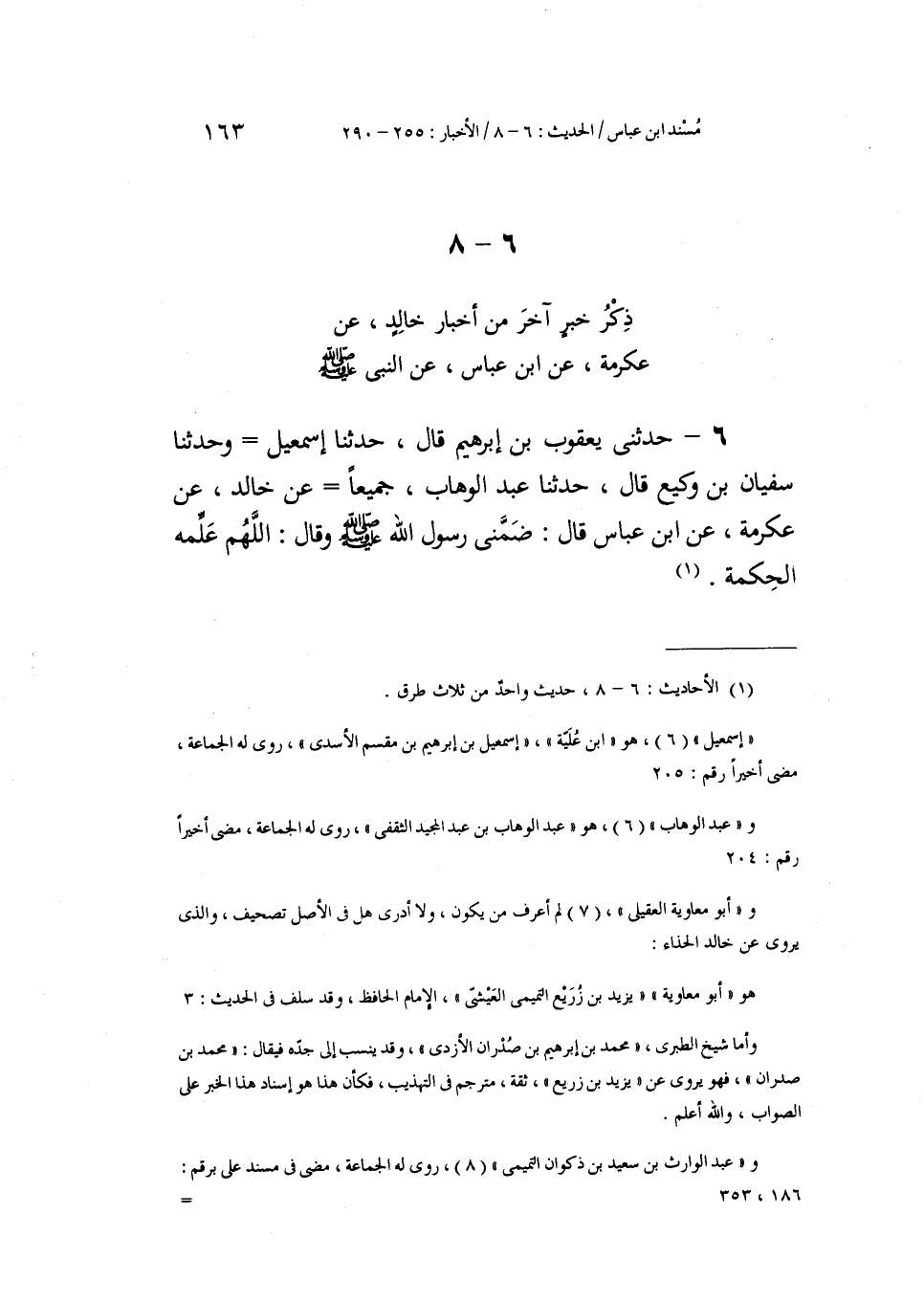 حَدَّثَنِي يَعْقُوبُ بْنُ إِبْرَاهِيمَ، قَالَ: حَدَّثَنَا إِسْمَاعِيلُ، وَحَدَّثَنَا سُفْيَانُ بْنُ وَكِيعٍ، قَالَ: حَدَّثَنَا عَبْدُ الْوَهَّابِ جَمِيعًا عَنْ خَالِدٍ، عَنْ عِكْرِمَةَ، عَنِ ابْنِ عَبَّاسٍ، قَالَ: ضَمَّنِي رَسُولُ اللَّهِ صَلَّى اللهُ عَلَيْهِ وَسَلَّمَ وَقَالَ: «§اللَّهُمَّ عَلِّمْهُ الْحِكْمَةَ»