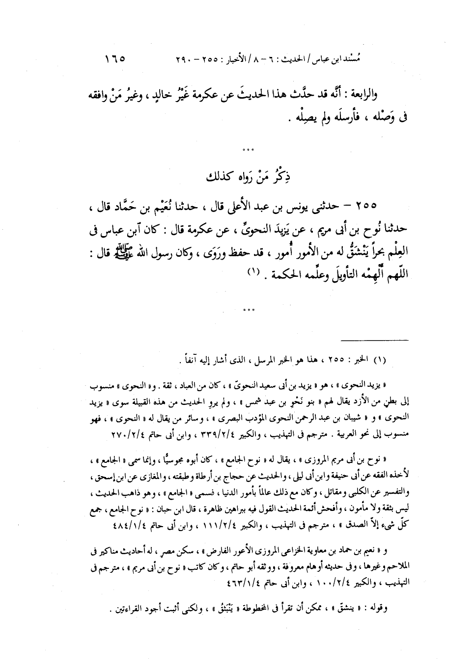 255 - حَدَّثَنِي يُونُسُ بْنُ عَبْدِ الْأَعْلَى، قَالَ: حَدَّثَنَا نُعَيْمُ بْنُ حَمَّادٍ، قَالَ: حَدَّثَنَا نُوحُ بْنُ أَبِي مَرْيَمَ، عَنْ يَزِيدَ النَّحْوِيِّ، عَنْ عِكْرِمَةَ، قَالَ: كَانَ ابْنُ عَبَّاسٍ فِي الْعِلْمِ بَحْرًا يَنْشَقُّ لَهُ مِنَ الْأُمُورِ أُمُورٌ، قَدْ حَفِظَ وَرَوَى، وَكَانَ رَسُولُ اللَّهِ صَلَّى اللهُ عَلَيْهِ وَسَلَّمَ قَالَ: «§اللَّهُمَّ أَلْهِمْهُ التَّأْوِيلَ وَعَلِّمْهُ الْحِكْمَةَ» -[166]- وَقَدْ وَافَقَ خَالِدًا فِي وَصْلِ هَذَا الْخَبَرِ عَنْ عِكْرِمَةَ، عَنِ ابْنِ عَبَّاسٍ غَيْرُهُ