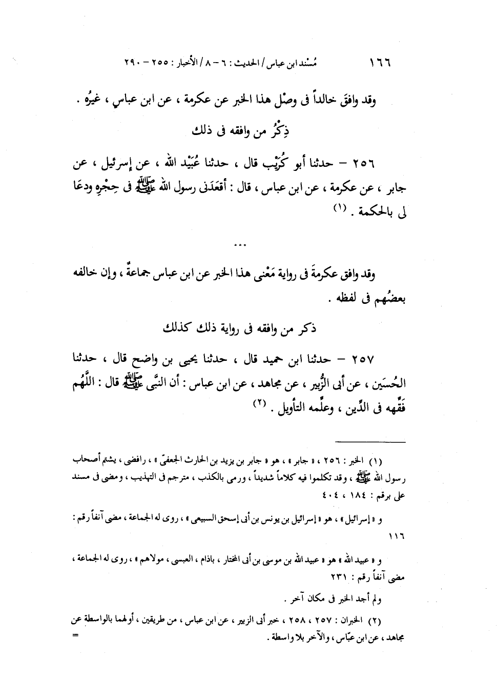 256 - حَدَّثَنَا أَبُو كُرَيْبٍ، قَالَ: حَدَّثَنَا عُبَيْدُ اللَّهِ، عَنْ إِسْرَائِيلَ، عَنْ جَابِرٍ، عَنْ عِكْرِمَةَ، عَنِ ابْنِ عَبَّاسٍ، قَالَ: «§أَقْعَدَنِي رَسُولُ اللَّهِ صَلَّى اللهُ عَلَيْهِ وَسَلَّمَ فِي حِجْرِهِ وَدَعَا لِي بِالْحِكْمَةِ» وَقَدْ وَافَقَ عِكْرِمَةَ فِي رِوَايَةِ مَعْنَى هَذَا الْخَبَرِ عَنِ ابْنِ عَبَّاسٍ جَمَاعَةٌ، وَإِنْ خَالَفَهُ بَعْضُهُمْ فِي لَفْظِهِ