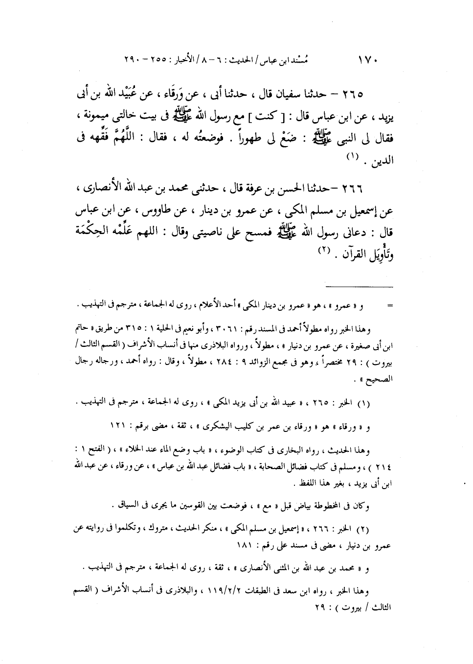 266 - حَدَّثَنَا الْحَسَنُ بْنُ عَرَفَةَ، قَالَ: حَدَّثَنِي مُحَمَّدُ بْنُ عَبْدِ اللَّهِ الْأَنْصَارِيُّ، عَنْ إِسْمَاعِيلَ بْنِ مُسْلِمٍ الْمَكِّيِّ، عَنْ عَمْرِو بْنِ دِينَارٍ، عَنْ طَاوُسٍ، عَنِ ابْنِ عَبَّاسٍ، قَالَ: دَعَانِي رَسُولُ اللَّهِ صَلَّى اللهُ عَلَيْهِ وَسَلَّمَ فَمَسَحَ عَلَى نَاصِيَتِي وَقَالَ: «§اللَّهُمَّ عَلِّمْهُ الْحِكْمَةَ وَتَأْوِيلَ الْقُرْآنِ»