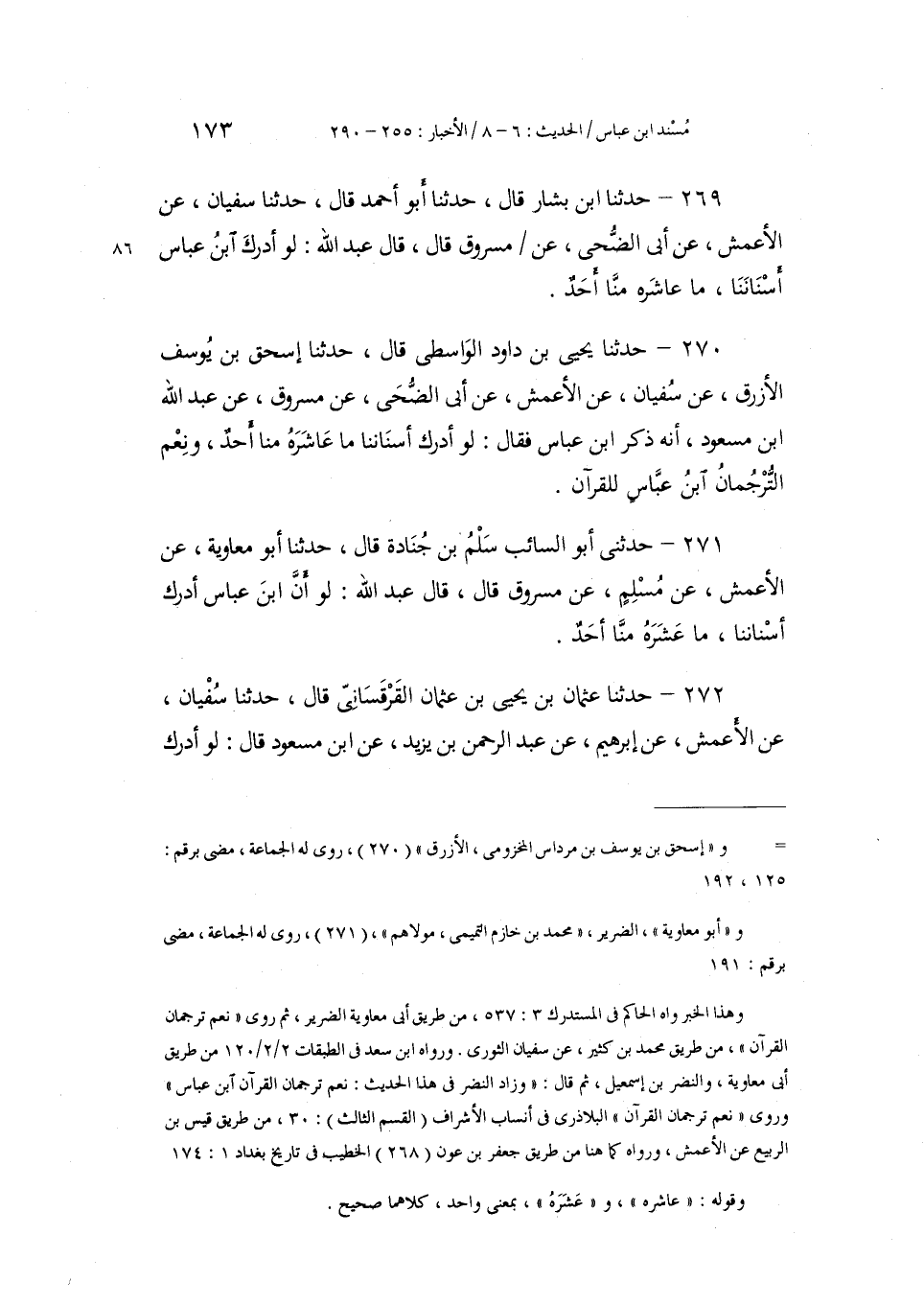 270 - حَدَّثَنَا يَحْيَى بْنُ دَاوُدَ الْوَاسِطِيُّ، قَالَ: حَدَّثَنَا إِسْحَاقُ بْنُ يُوسُفَ الْأَزْرَقُ، عَنْ سُفْيَانَ، عَنِ الْأَعْمَشِ، عَنْ أَبِي الضُّحَى، عَنْ مَسْرُوقٍ، عَنْ عَبْدِ اللَّهِ بْنِ مَسْعُودٍ أَنَّهُ ذَكَرَ ابْنَ عَبَّاسٍ، فَقَالَ: «§لَوْ أَدْرَكَ أَسْنَانَنَا مَا عَاشَرَهُ مِنَّا أَحَدٌ، وَنِعْمَ التُّرْجُمَانُ ابْنُ عَبَّاسٍ لِلْقُرْآنِ»