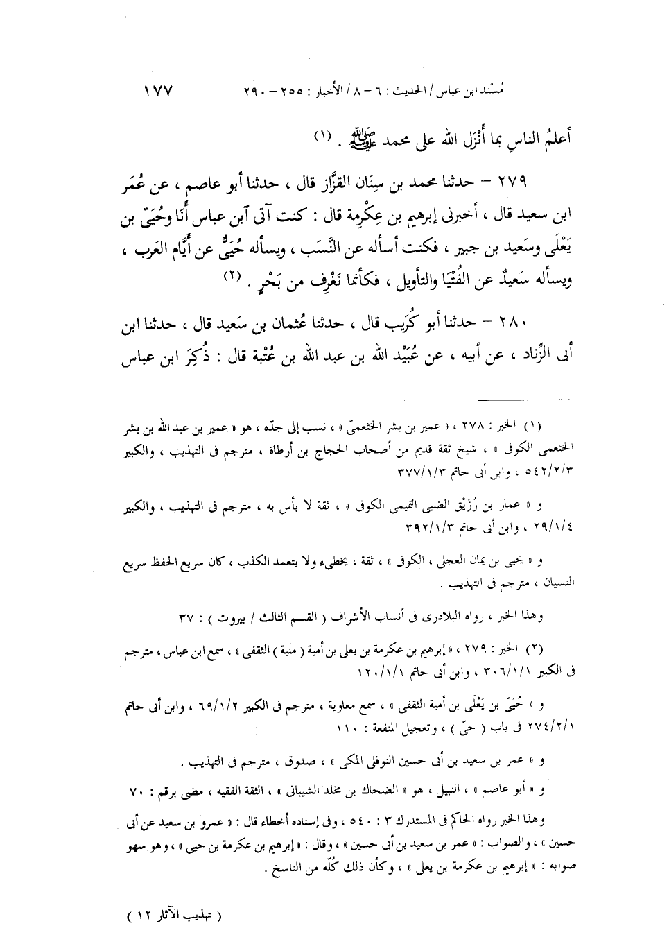 279 - حَدَّثَنَا مُحَمَّدُ بْنُ سِنَانٍ الْقَزَّازُ، قَالَ: حَدَّثَنَا أَبُو عَاصِمٍ، عَنْ عُمَرَ بْنِ سَعِيدٍ، قَالَ: أَخْبَرَنِي إِبْرَاهِيمُ بْنُ عِكْرِمَةَ، قَالَ: كُنْتُ آتِي ابْنَ عَبَّاسٍ أَنَا وْحُيَيُّ بْنُ يَعْلَى وَسَعِيدُ بْنُ جُبَيْرٍ، فَكُنْتُ أَسْأَلُهُ عَنِ النَّسَبِ، وَيَسْأَلُهُ حُيَيُّ عَنْ أَيَّامِ الْعَرَبِ، وَيَسْأَلُهُ سَعِيدٌ عَنِ الْفُتْيَا، وَالتَّأْوِيلِ، §فَكَأَنَّمَا نَغْرِفُ مِنْ بَحْرٍ "