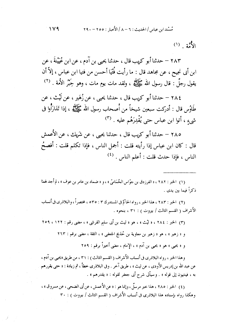 284 - حَدَّثَنَا أَبُو كُرَيْبٍ، قَالَ: حَدَّثَنَا يَحْيَى، عَنْ زُهَيْرٍ، عَنْ لَيْثٍ، عَنْ طَاوُسٍ، قَالَ: «§أَدْرَكْتُ سَبْعِينَ شَيْخًا مِنْ أَصْحَابِ رَسُولِ اللَّهِ صَلَّى اللهُ عَلَيْهِ وَسَلَّمَ، إِذَا تَدَارَءُوا فِي شَيْءٍ أَتَوَا ابْنَ عَبَّاسٍ حَتَّى يُقْدِرَهُمْ عَلَيْهِ»