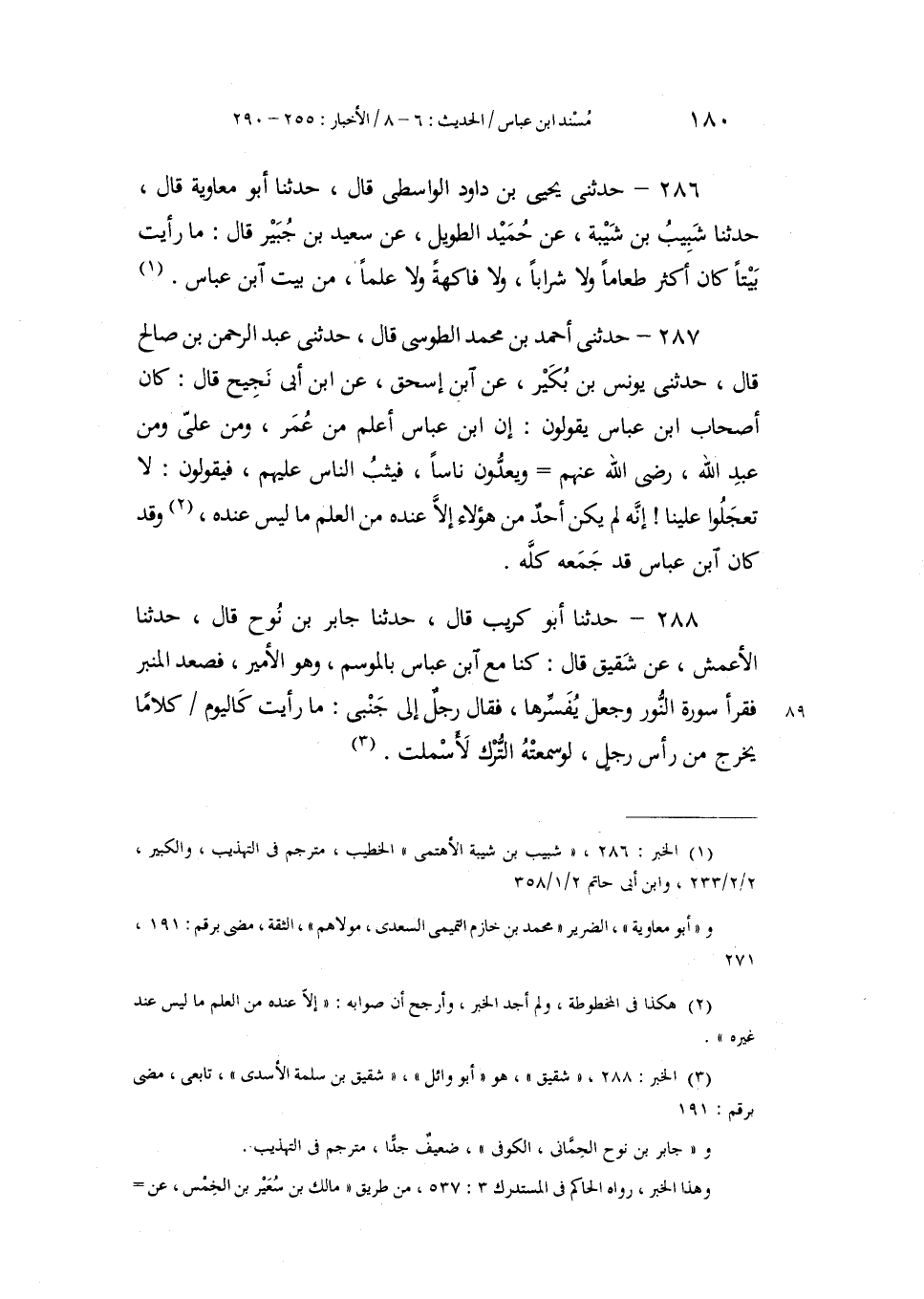 287 - حَدَّثَنِي أَحْمَدُ بْنُ مُحَمَّدٍ الطُّوسِيُّ، قَالَ: حَدَّثَنِي عَبْدُ الرَّحْمَنِ بْنُ صَالِحٍ، قَالَ: حَدَّثَنِي يُونُسُ بْنُ بُكَيْرٍ، عَنِ ابْنِ إِسْحَاقَ، عَنِ ابْنِ أَبِي نَجِيحٍ، قَالَ: " §كَانَ أَصْحَابُ ابْنِ عَبَّاسٍ يَقُولُونَ: إِنَّ ابْنَ عَبَّاسٍ أَعْلَمُ مِنْ عُمَرَ، وَمِنْ عَلِيٍّ، وَمِنْ عَبْدِ اللَّهِ رَضِيَ اللَّهُ عَنْهُمْ وَيَعُدُّونَ نَاسًا، فَيَثِبُ النَّاسُ عَلَيْهِمْ، فَيَقُولُونَ: لَا تَعْجَلُوا عَلَيْنَا إِنَّهُ لَمْ يَكُنْ أَحَدٌ مِنْ هَؤُلَاءِ إِلَّا عِنْدَهُ مِنَ الْعِلْمِ مَا لَيْسَ عِنْدَهُ، وَقَدْ كَانَ ابْنُ عَبَّاسٍ قَدْ جَمَعَهُ كُلَّهُ "