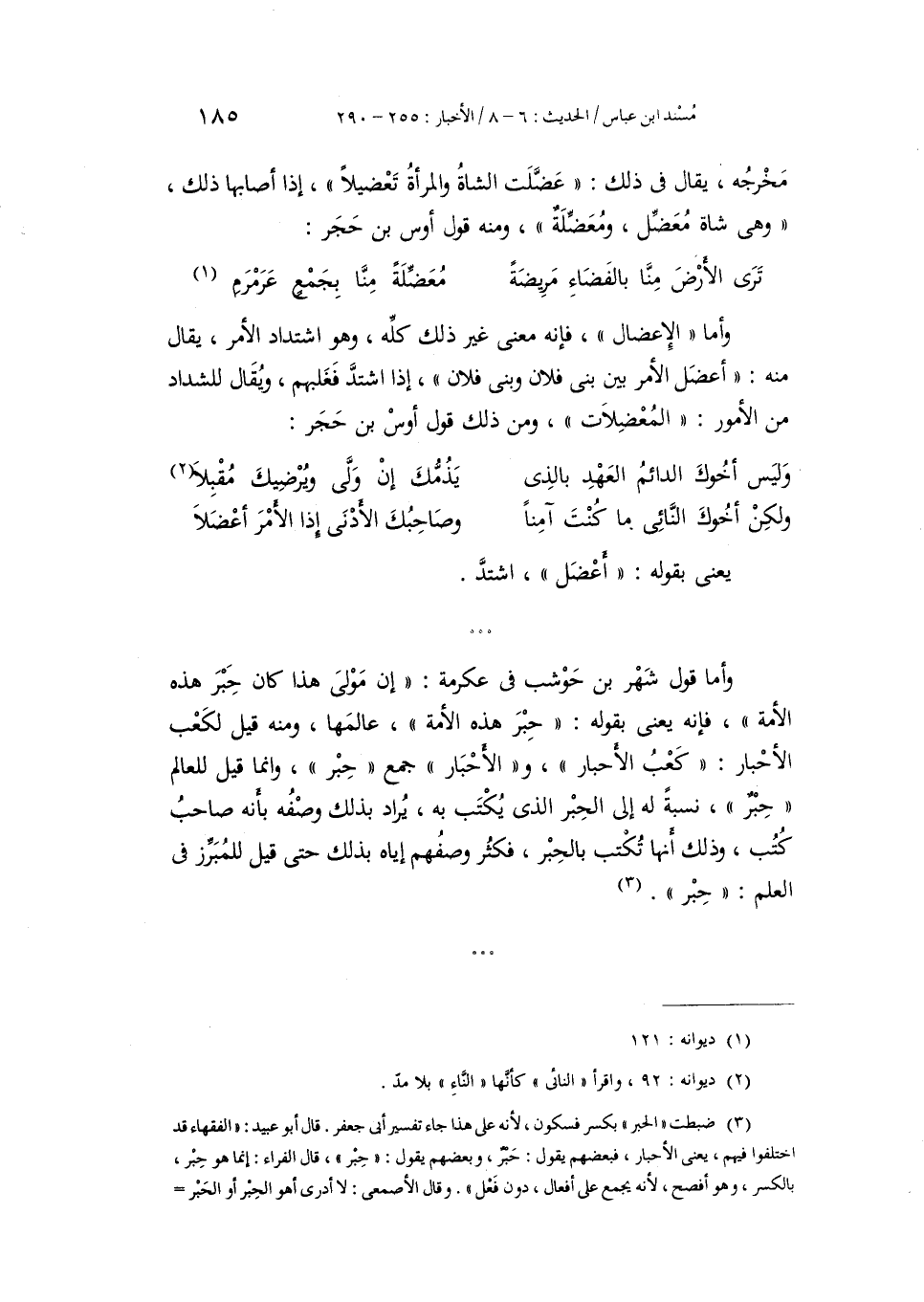 يَعْنِي بِقَوْلِهِ: «أَعْضَلَ» : اشْتَدَّ، وَأَمَّا قَوْلُ شَهْرِ بْنِ حَوْشَبٍ فِي عِكْرِمَةَ: " إِنَّ مَوْلَى هَذَا كَانَ حَبْرَ هَذِهِ الْأُمَّةِ، فَإِنَّهُ يَعْنِي بِقَوْلِهِ: «حَبْرَ هَذِهِ الْأُمَّةِ» : عَالِمَهَا، وَمِنْهُ قِيلَ لِكَعْبِ الْأَحْبَارِ: «كَعْبُ الْأَحْبَارِ» ، وَالْأَحْبَارُ جَمْعُ حَبْرٍ، وَإِنَّمَا قِيلَ لِلْعَالِمِ حَبْرٌ نِسْبَةً لَهُ إِلَى الْحِبْرِ الَّذِي يَكْتُبُ بِهِ، يُرَادُ بِذَلِكَ وَصْفُهُ بِأَنَّهُ صَاحِبُ كُتُبٍ، وَذَلِكَ أَنَّهَا تُكْتَبُ بِالْحِبْرِ، فَكَثُرَ وَصْفُهُمْ إِيَّاهُ بِذَلِكَ حَتَّى قِيلَ لِلْمُبَرِّزِ فِي الْعِلْمِ: حَبْرٌ