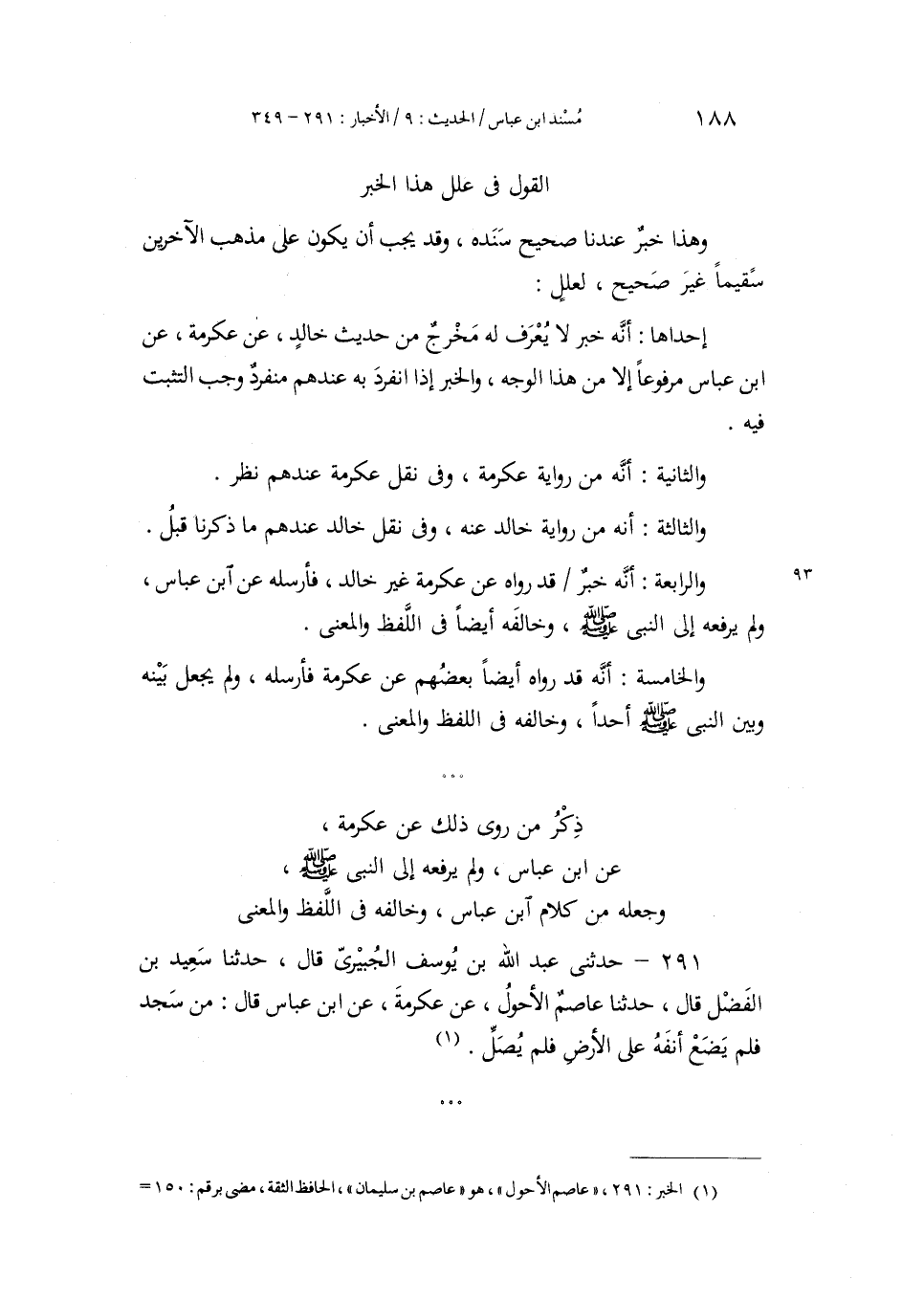 291 - حَدَّثَنِي عَبْدُ اللَّهِ بْنُ يُوسُفَ الْجُبَيْرِيُّ، قَالَ: حَدَّثَنَا سَعِيدُ بْنُ الْفَضْلِ، قَالَ: حَدَّثَنَا عَاصِمٌ الْأَحْوَلُ، عَنْ عِكْرِمَةَ، عَنِ ابْنِ عَبَّاسٍ، قَالَ: «§مَنْ سَجَدَ فَلَمْ يَضَعْ أَنْفَهُ عَلَى الْأَرْضِ فَلَمْ يُصَلِّ»