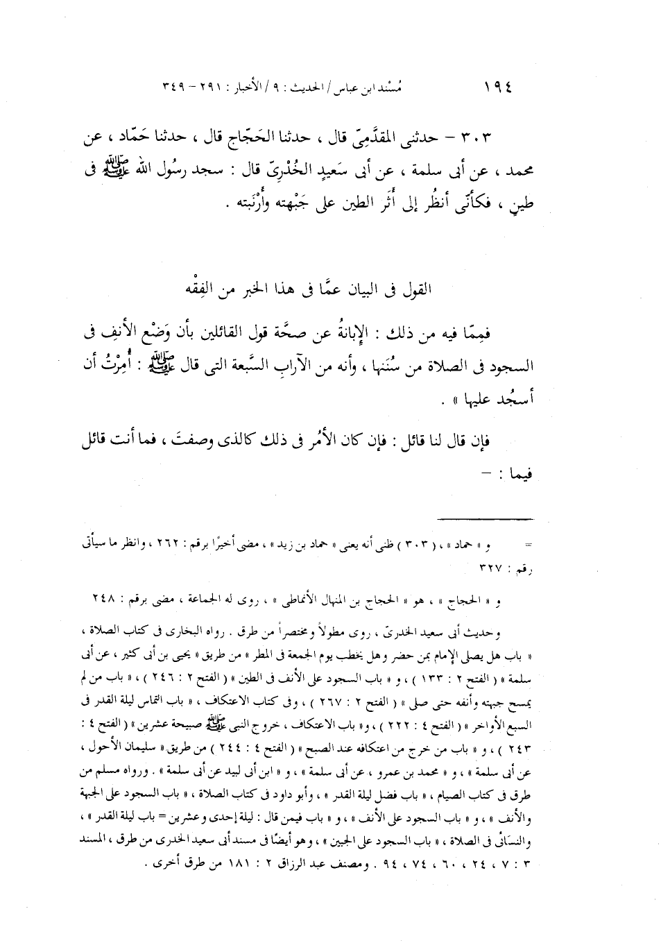 303 - حَدَّثَنِي الْمُقَدَّمِيُّ، قَالَ: حَدَّثَنَا الْحَجَّاجُ، قَالَ: حَدَّثَنَا حَمَّادٌ، عَنْ مُحَمَّدٍ، عَنْ أَبِي سَلَمَةَ، عَنْ أَبِي سَعِيدٍ الْخُدْرِيِّ، قَالَ: «§سَجَدَ رَسُولُ اللَّهِ صَلَّى اللهُ عَلَيْهِ وَسَلَّمَ فِي طِينٍ، فَكَأَنِّي أَنْظُرُ إِلَى أَثَرِ الطِّينِ عَلَى جَبْهَتِهِ وَأَرْنَبَتِهِ»