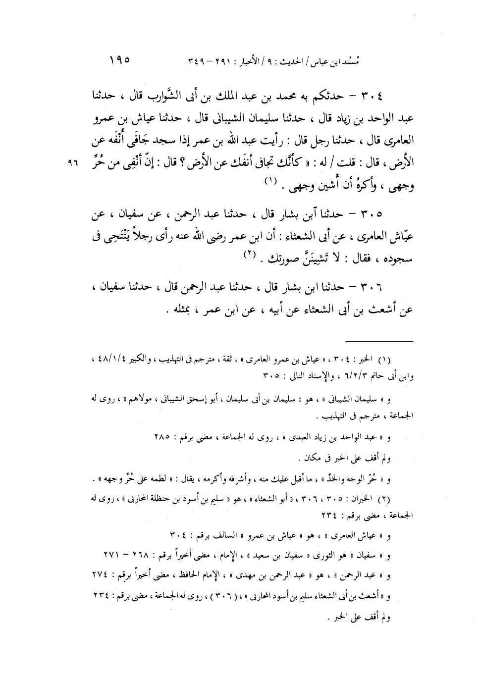 304 - حَدَّثَكُمْ بِهِ مُحَمَّدُ بْنُ عَبْدِ الْمَلِكِ بْنِ أَبِي الشَّوَارِبِ، قَالَ: حَدَّثَنَا عَبْدُ الْوَاحِدِ بْنُ زِيَادٍ، قَالَ: حَدَّثَنَا سُلَيْمَانُ الشَّيْبَانِيُّ، قَالَ: حَدَّثَنَا عَيَّاشُ بْنُ عَمْرٍو الْعَامِرِيُّ، قَالَ: حَدَّثَنَا رَجُلٌ، قَالَ: رَأَيْتُ عَبْدَ اللَّهِ بْنَ عُمَرَ إِذَا سَجَدَ جَافَى أَنْفَهُ عَنِ الْأَرْضِ، قَالَ: قُلْتُ: لَهُ: كَأَنَّكَ تُجَافِي أَنْفَكَ عَنِ الْأَرْضِ؟ قَالَ: «§إِنَّ أَنْفِي مِنْ حُرِّ وَجْهِي، وَأَكْرَهُ أَنْ أَشِينَ وَجْهِي»