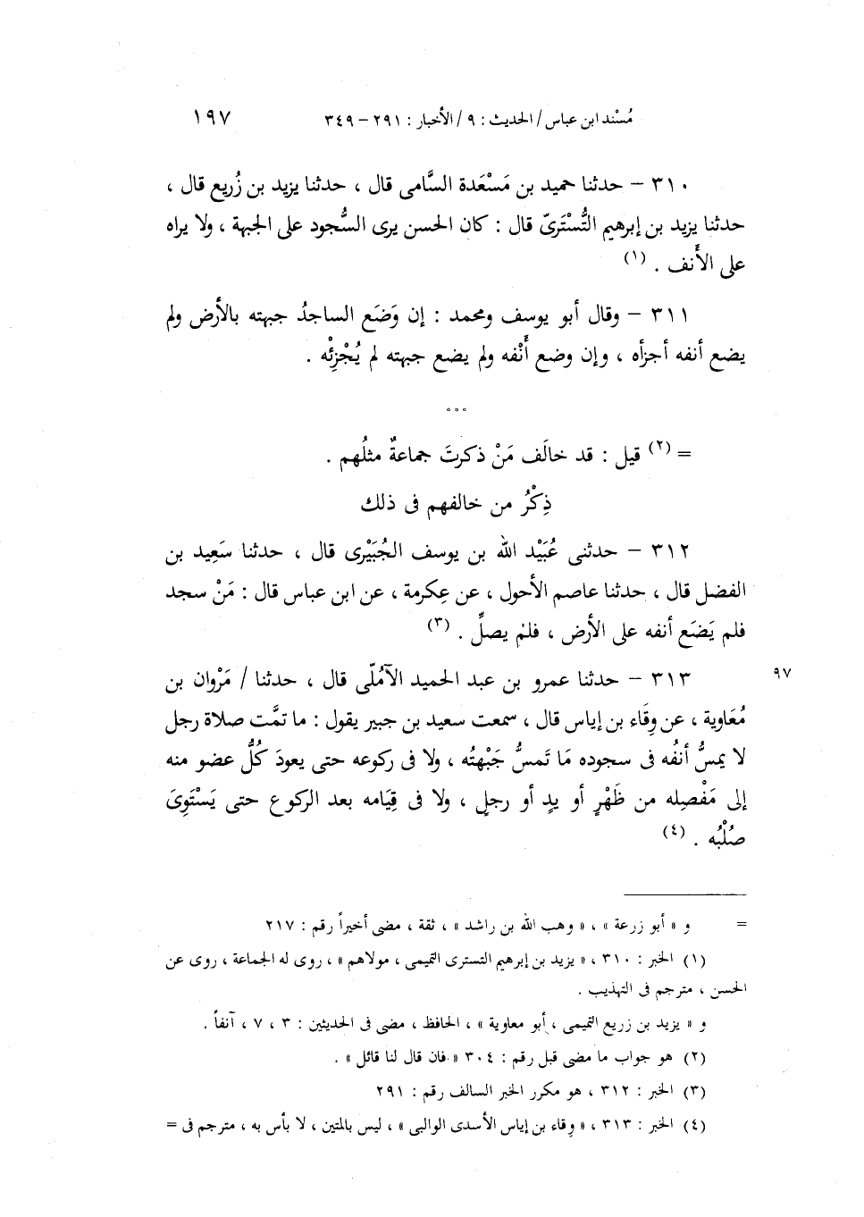 310 - حَدَّثَنَا حُمَيْدُ بْنُ مَسْعَدَةَ السَّامِيُّ، قَالَ: حَدَّثَنَا يَزِيدُ بْنُ زُرَيْعٍ، قَالَ: حَدَّثَنَا يَزِيدُ بْنُ إِبْرَاهِيمَ التُّسْتَرِيُّ، قَالَ: كَانَ الْحَسَنُ «§يَرَى السُّجُودَ عَلَى الْجَبْهَةِ، وَلَا يَرَاهُ عَلَى الْأَنْفِ»