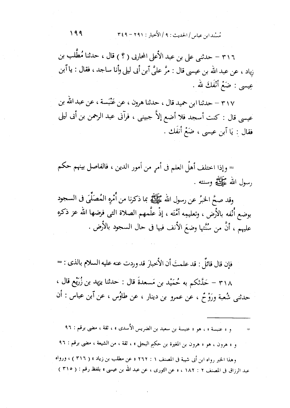 317 - حَدَّثَنَا ابْنُ حُمَيْدٍ، قَالَ: حَدَّثَنَا هَارُونُ، عَنْ عَنْبَسَةَ، عَنْ عَبْدِ اللَّهِ بْنِ عِيسَى، قَالَ: كُنْتُ أَسْجُدُ فَلَا أَضَعُ إِلَّا جَبِينِي، فَرَآنِي عَبْدُ الرَّحْمَنِ بْنُ أَبِي لَيْلَى، فَقَالَ: «يَا §ابْنَ عِيسَى، ضَعْ أَنْفَكَ» وَإِذَا اخْتَلَفَ أَهْلُ الْعِلْمِ فِي أَمْرٍ مِنْ أُمُورِ الدِّينِ، فَالْفَاصِلُ بَيْنَهُمْ حُكْمُ رَسُولِ اللَّهِ صَلَّى اللهُ عَلَيْهِ وَسَلَّمَ وَسُنَّتُهِ، وَقَدْ صَحَّ الْخَبَرُ عَنْ رَسُولِ اللَّهِ صَلَّى اللهُ عَلَيْهِ وَسَلَّمَ بِمَا ذَكَرْنَا مِنْ أَمْرِهِ الْمُصَلِّي فِي السُّجُودِ بِوَضْعِ أَنْفِهِ بِالْأَرْضِ، وَتَعْلِيمِهِ أُمَّتِهِ، إِذْ عَلَّمَهُمُ الصَّلَاةَ الَّتِي فَرَضَهَا اللَّهُ عَزَّ ذِكْرُهُ عَلَيْهِمْ، أَنَّ مِنْ سُنَّتِهَا وَضْعَ الْأَنْفِ فِيهَا فِي حَالِ السُّجُودِ بِالْأَرْضِ، فَإِنْ قَالَ قَائِلٌ: قَدْ عَلِمْتَ أَنَّ الْأَخْبَارَ قَدْ وَرَدَتْ عَنْهُ عَلَيْهِ السَّلَامُ بِالَّذِي:
