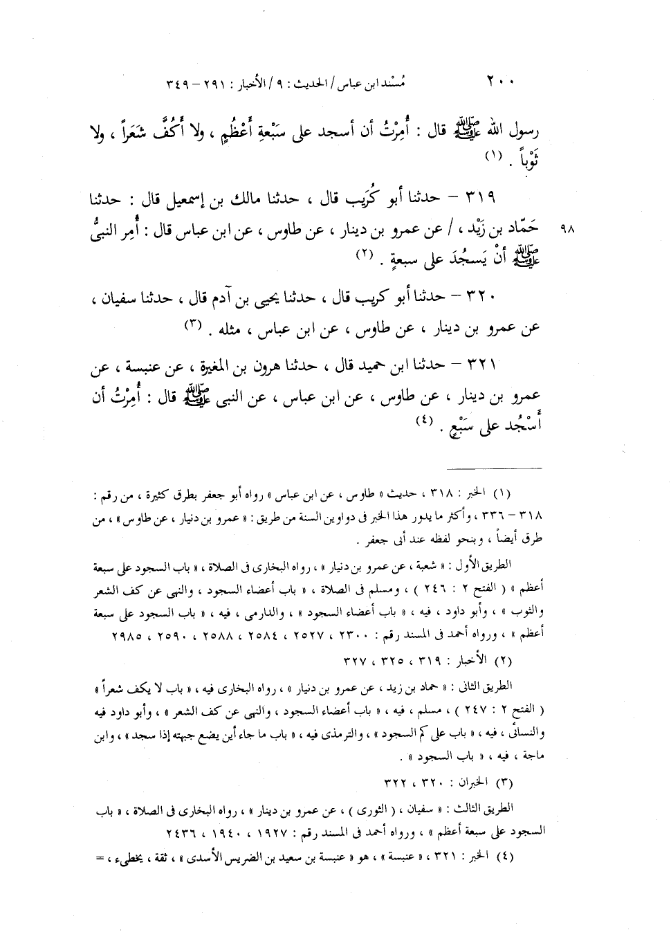 319 - حَدَّثَنَا أَبُو كُرَيْبٍ، قَالَ: حَدَّثَنَا مَالِكُ بْنُ إِسْمَاعِيلَ، قَالَ: حَدَّثَنَا حَمَّادُ بْنُ زَيْدٍ، عَنْ عَمْرِو بْنِ دِينَارٍ، عَنْ طَاوُسٍ، عَنِ ابْنِ عَبَّاسٍ، قَالَ: «§أُمِرَ النَّبِيُّ صَلَّى اللهُ عَلَيْهِ وَسَلَّمَ أَنْ يَسْجُدَ عَلَى سَبْعَةٍ»