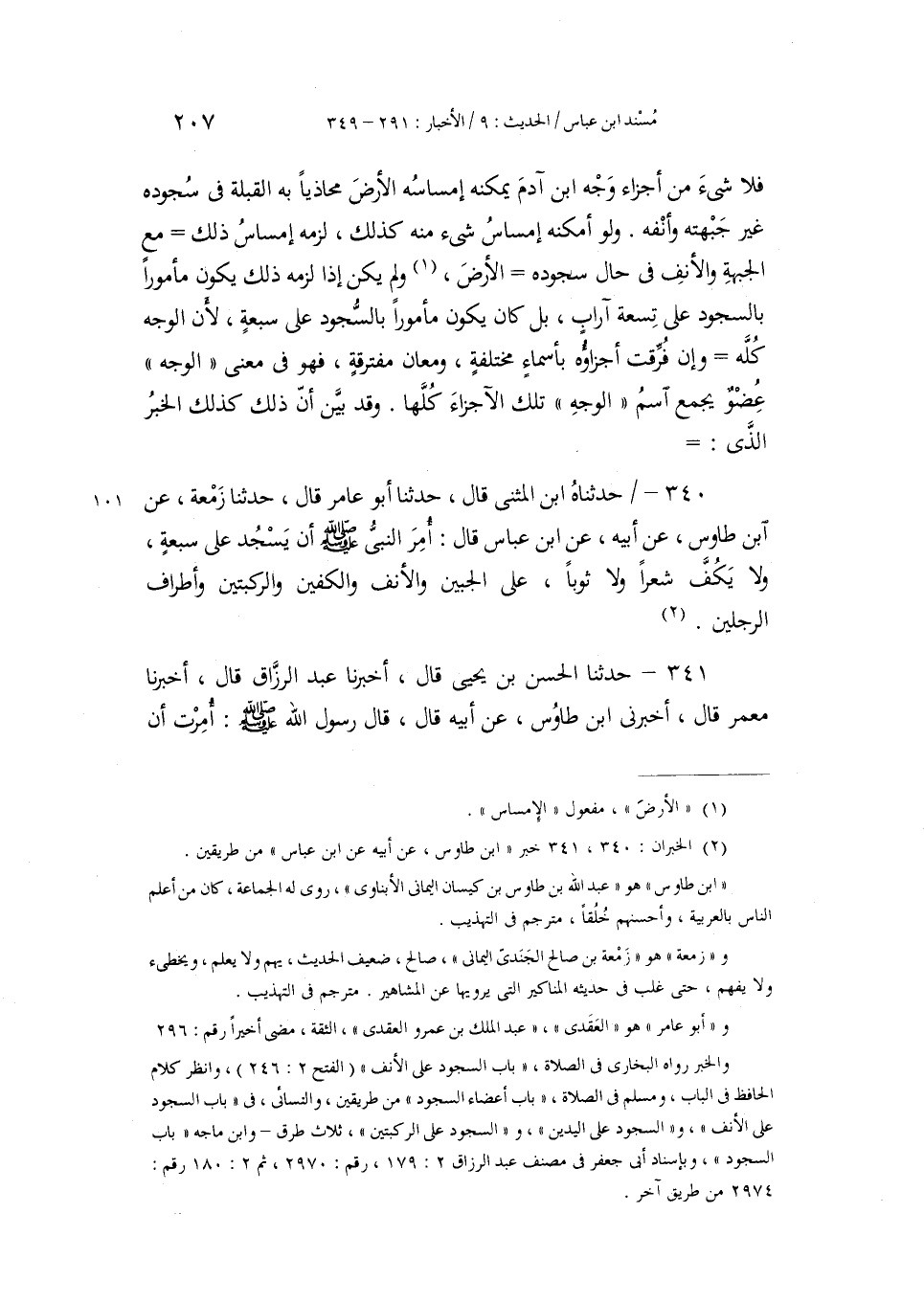 340 - حَدَّثَنَاهُ ابْنُ الْمُثَنَّى، قَالَ: حَدَّثَنَا أَبُو عَامِرٍ، قَالَ: حَدَّثَنَا زَمْعَةُ، عَنِ ابْنِ طَاوُسٍ، عَنْ أَبِيهِ، عَنِ ابْنِ عَبَّاسٍ، قَالَ: " §أُمِرَ النَّبِيُّ صَلَّى اللهُ عَلَيْهِ وَسَلَّمَ أَنْ يَسْجُدَ عَلَى سَبْعَةٍ، وَلَا يَكُفَّ شَعْرًا وَلَا ثَوْبًا: عَلَى الْجَبِينِ، وَالْأَنْفِ، وَالْكَفَّيْنِ، وَالرُّكْبَتَيْنِ، وَأَطْرَافِ الرِّجْلَيْنِ "