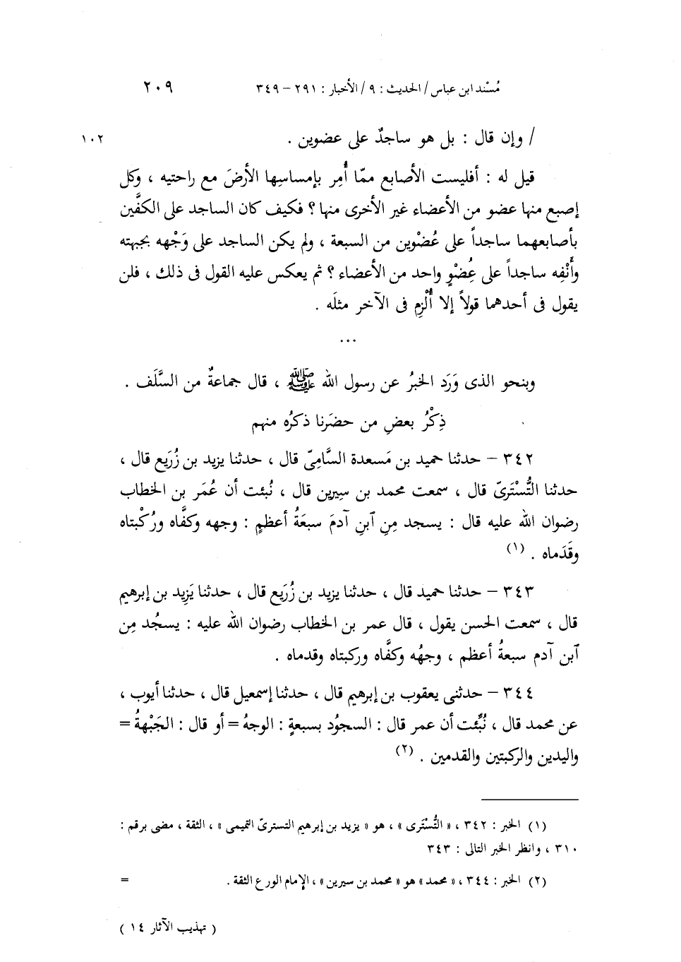 342 - حَدَّثَنَا حُمَيْدُ بْنُ مَسْعَدَةَ السَّامِيُّ، قَالَ: حَدَّثَنَا يَزِيدُ بْنُ زُرَيْعٍ، قَالَ: حَدَّثَنَا التُّسْتَرِيُّ، قَالَ: سَمِعْتُ مُحَمَّدَ بْنَ سِيرِينَ، قَالَ: نُبِّئْتُ أَنَّ عُمَرَ بْنَ الْخَطَّابِ رِضْوَانُ اللَّهِ عَلَيْهِ قَالَ: " §يَسْجُدُ مِنَ ابْنِ آدَمَ سَبْعَةُ أَعْظُمٍ: وَجْهُهُ، وَكَفَاهُ، وَرُكْبَتَاهُ، وَقَدَمَاهُ "