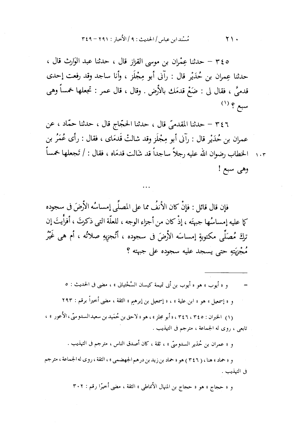 345 - حَدَّثَنَا عِمْرَانُ بْنُ مُوسَى الْقَزَّازُ، قَالَ: حَدَّثَنَا عَبْدُ الْوَارِثِ، قَالَ: حَدَّثَنَا عِمْرَانُ بْنُ حُدَيْرٍ، قَالَ: رَآنِي أَبُو مِجْلَزٍ - وَأَنَا سَاجِدٌ، وَقَدْ رُفِعَتْ إِحْدَى قَدَمَيَّ - فَقَالَ لِي: " §ضَعْ قَدَمَكَ بِالْأَرْضِ، وَقَالَ: قَالَ عُمَرُ: تَجْعَلُهَا خَمْسًا وَهِيَ سَبْعٌ؟
